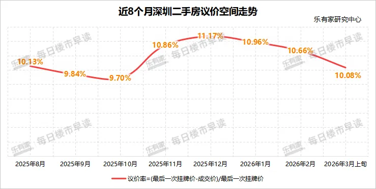 与业主端的价格韧性和局部回升形成对照的是买方议价权的快速收缩。乐有家研究中心数据显示,截至3月19日,深圳二手房成交的平均议价空间已收窄至10.08%,环比下降0.58个百分点。这是继2025年12月达到阶段性高点11.17%之后,连续第三个月的下滑,也是近五个月来的最低水平。
