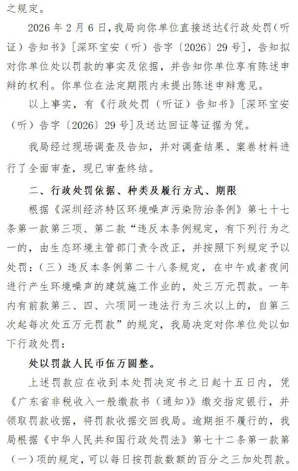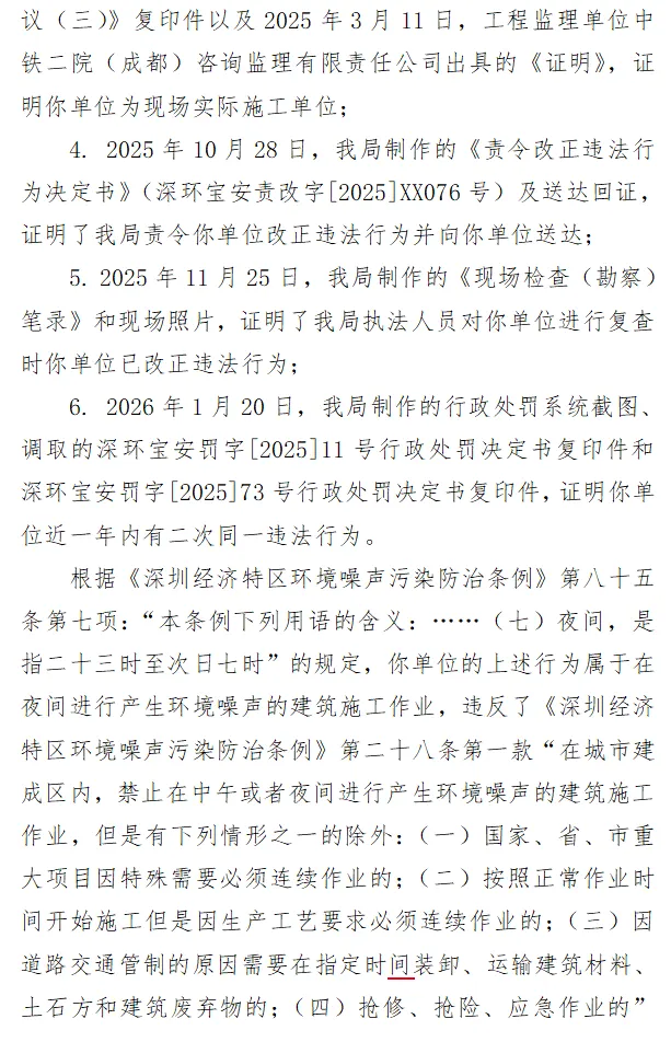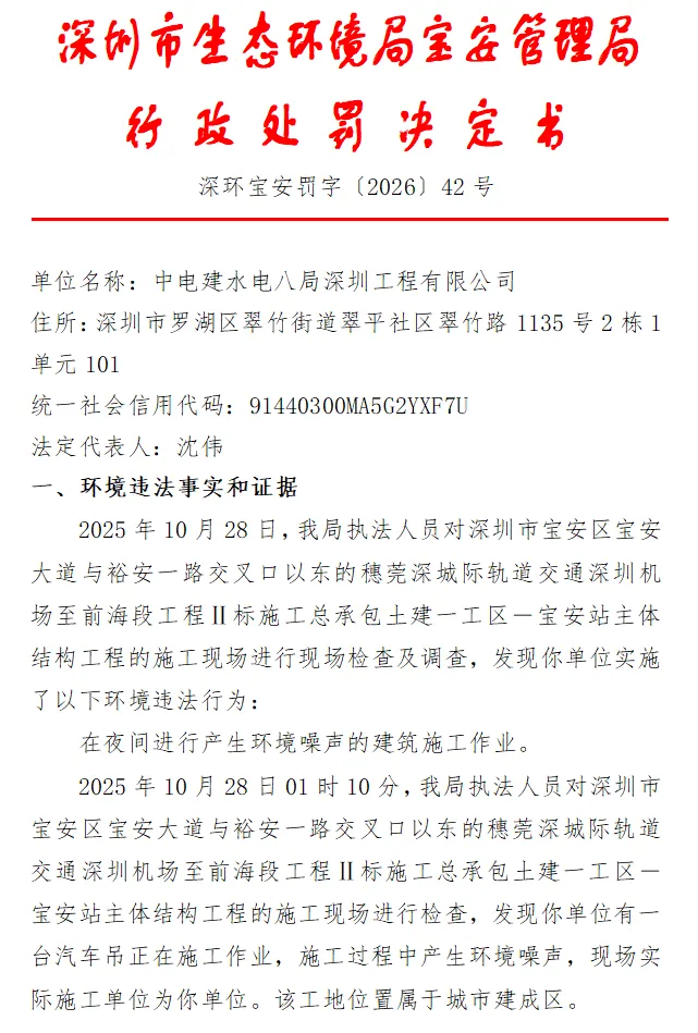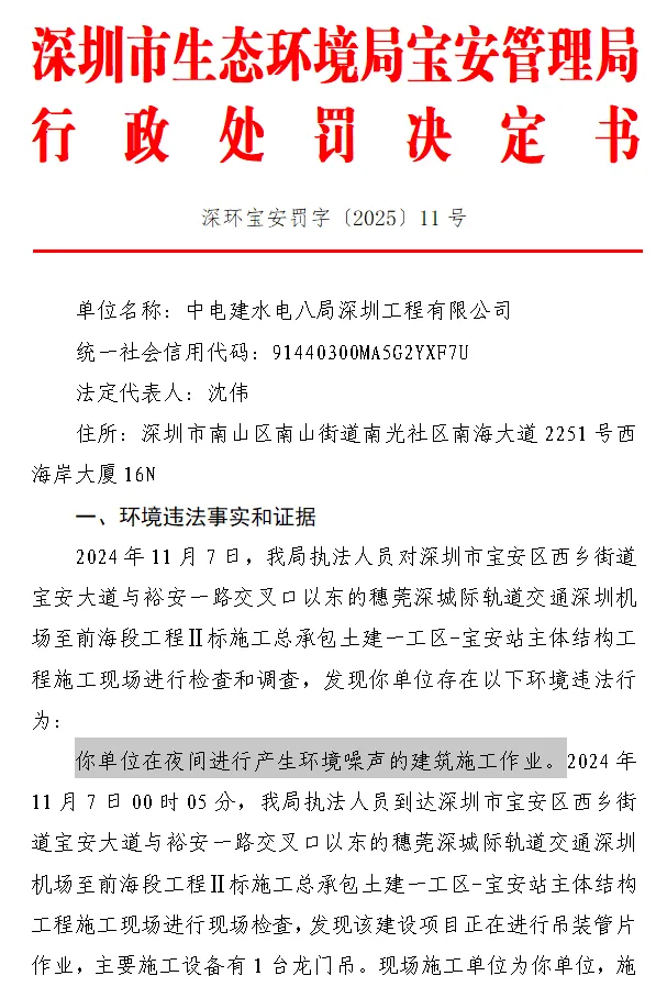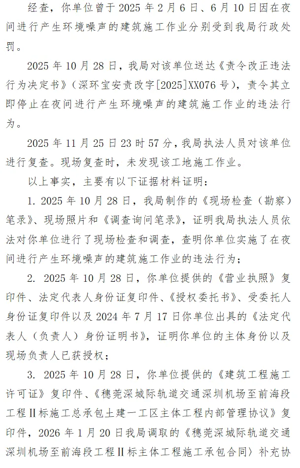 根据处罚决定书,2025年10月28日,执法人员在位于宝安区宝安大道与裕安一路交叉口以东的穗莞深城际轨道交通深圳机场至前海段工程Ⅱ标施工总承包土建一工区——宝安站主体结构工程现场检查时发现,该公司在夜间时段进行施工作业,产生环境噪声,构成违法行为。