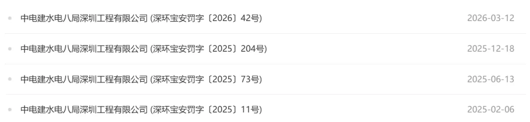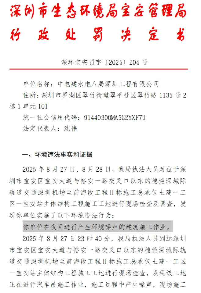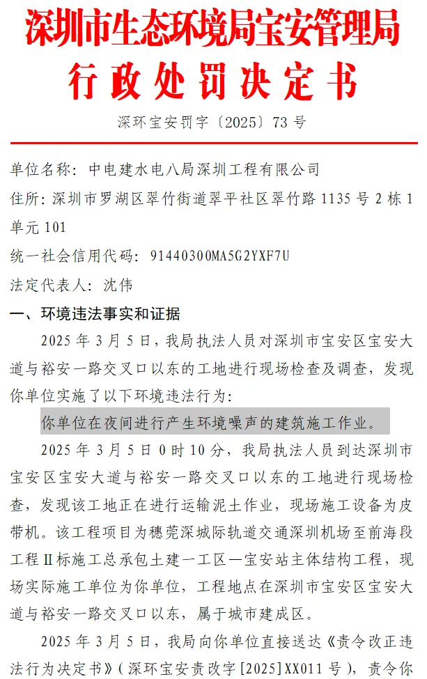 信息显示,中电建水电八局深圳工程有限公司因夜间违规进行产生噪声的建筑施工作业,被深圳市生态环境局宝安管理局处以5万元罚款。