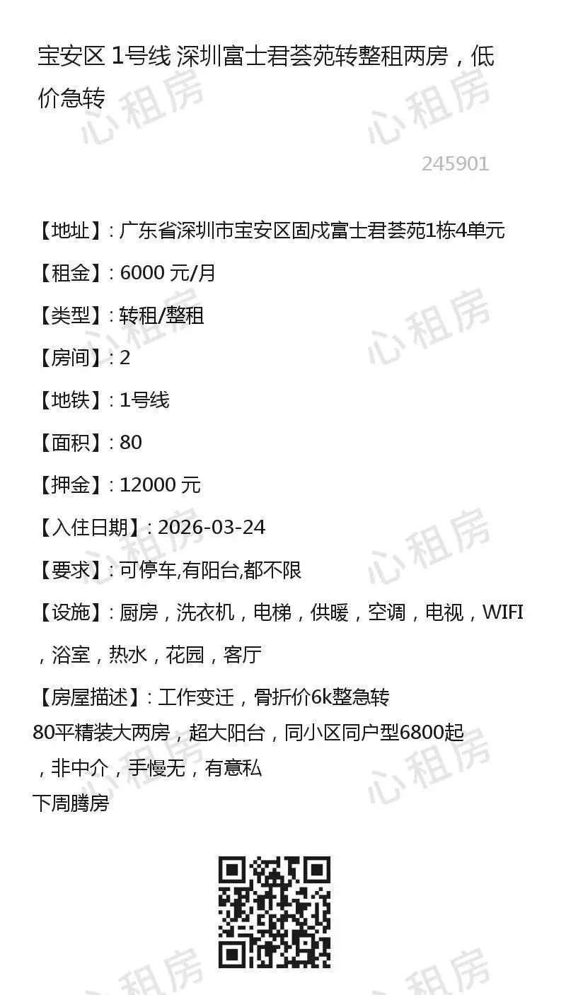 深圳租房【宝安5则】房源①:1号线深圳宝安富士君荟苑转整租两房6000元/月;房源②:…