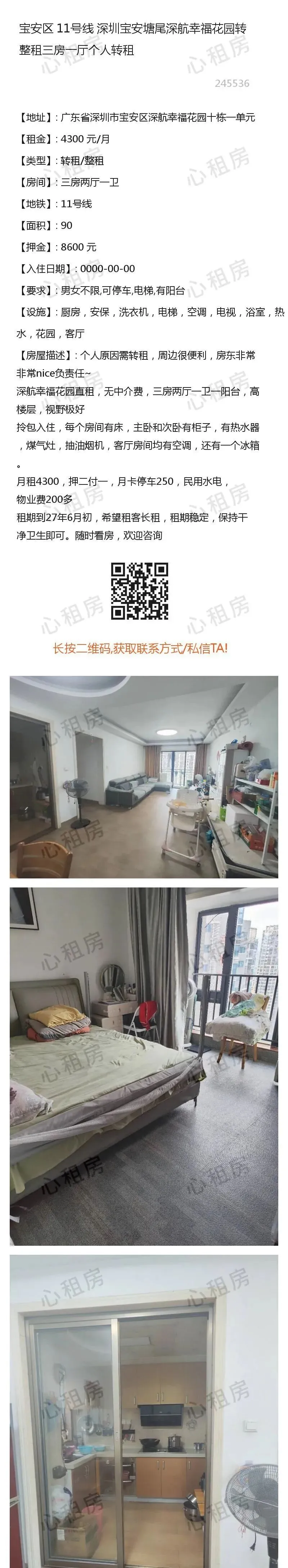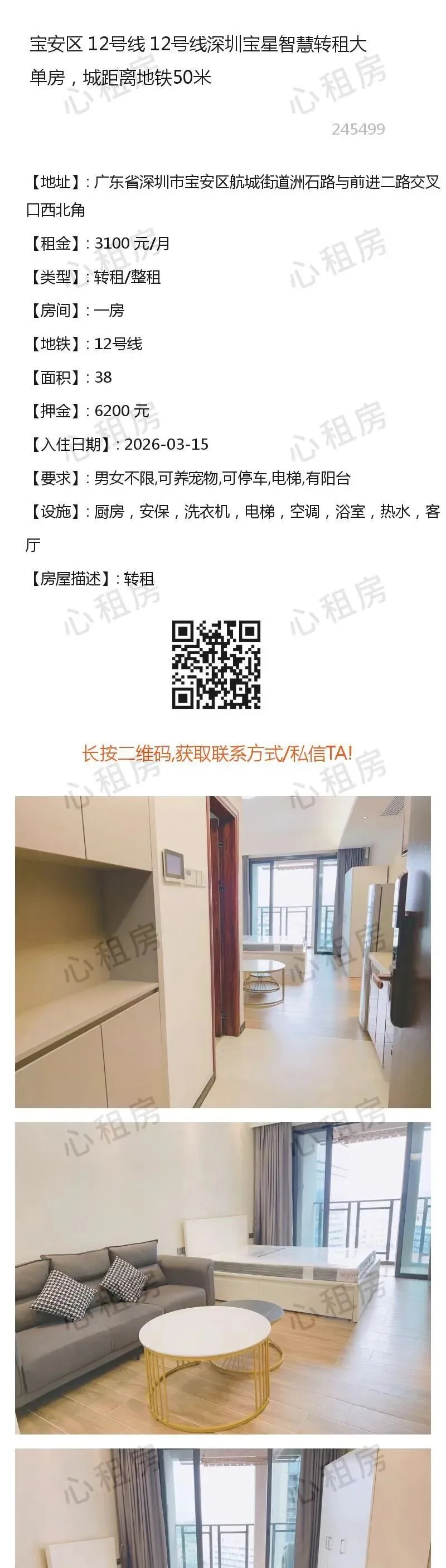 深圳租房>>宝安区1号线深圳宝安灵芝地铁水口花园合租房找室友,转租次卧1300元/月深圳租房>>宝安区11号线深圳宝安塘尾深航幸福花园转整租三房一厅个人转租4300元/月深圳租房>>宝安区12号线12号线深圳宝星智慧转租大单房,城距离地铁50米3100元/月
