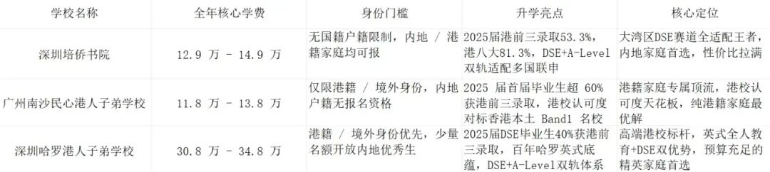 优先选深圳哈罗港人子弟学校。学校背靠百年哈罗公学,除了DSE学术课程,还有上百种课外活动、社团课程、全球研学资源,能全方位培养孩子的综合素养,不会把孩子培养成只会考试的机器,适配未来想走全球多国联申的孩子。