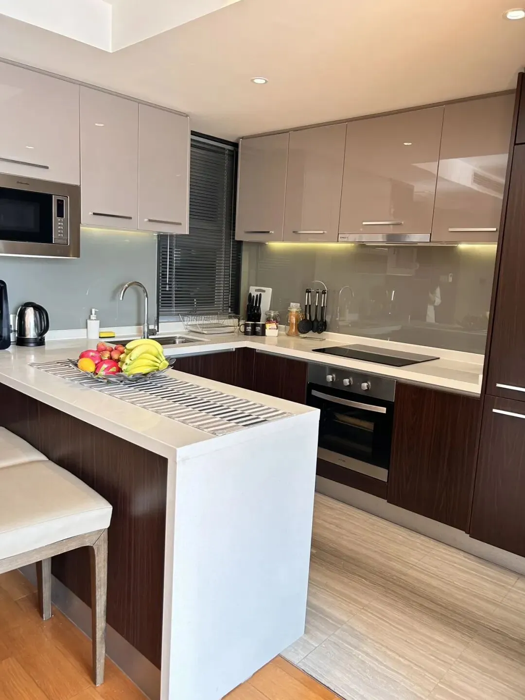 💁🏻♀️キッチンの床はタイル張りでお手入れが簡単です。作業台は広々としており傍には椅子が置かれ、出来立ての料理を簡単に楽しめます。キッチンにはオーブン、電子レンジ、食洗器、コーヒーメーカー、冷蔵庫など、調理設備が一式揃っています。料理の時間がより楽しいものとなるでしょう。