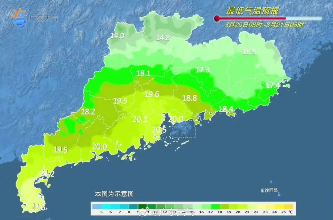 最低气温:粤北的偏北市县15-17℃,珠江口附近到粤西沿海市县21-23℃,其余市县17-21℃。