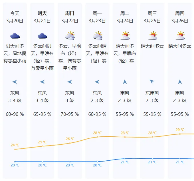 20-21日,受弱冷空气影响,云量增多,有零星小雨,气温略降,沿海高地偏东风6-7级;22-25日,大致多云,偶有零星小雨,早晚有轻雾或雾,气温回升,渐趋温暖。