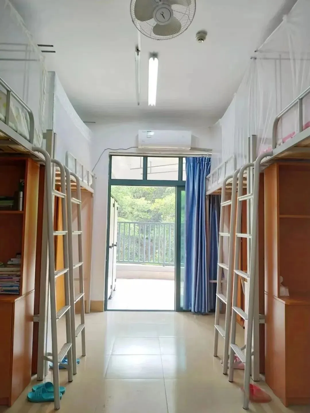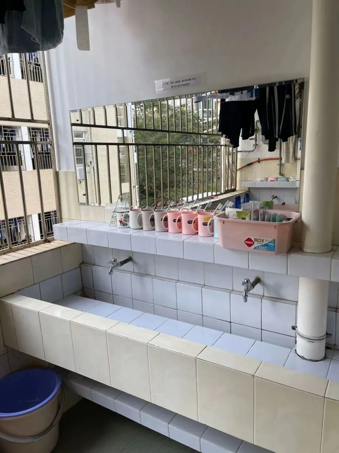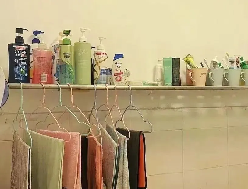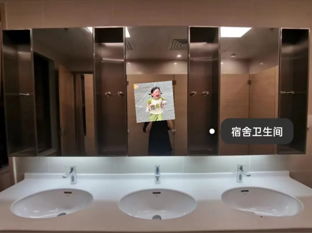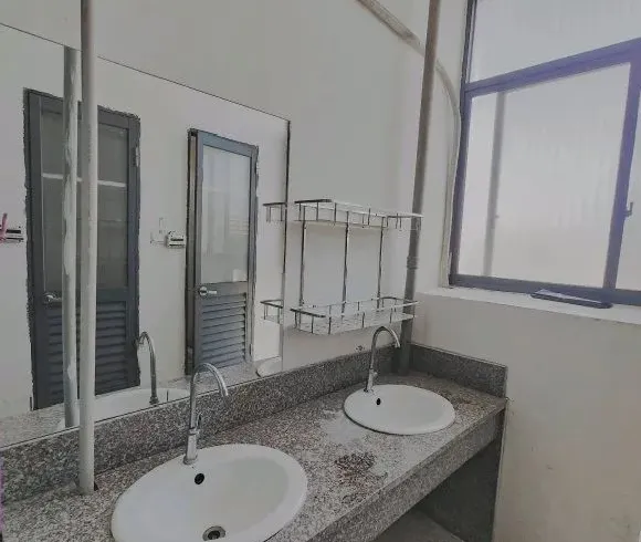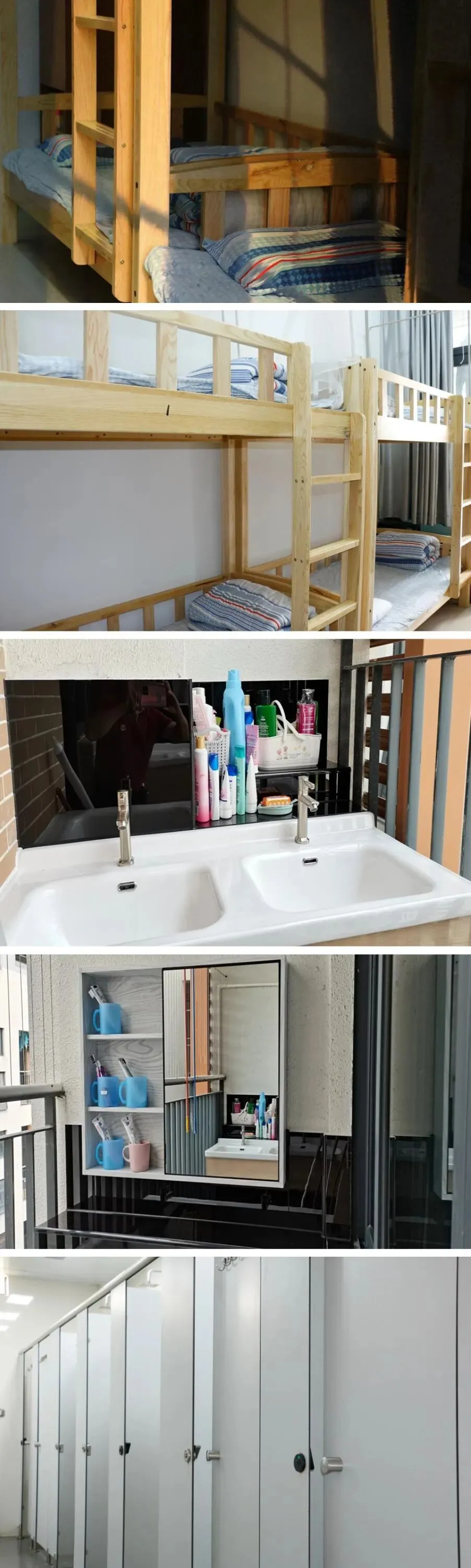 床铺为铁架床,有两个洗手台,两个独立卫浴,有阳台,有一面大镜子,面对着两个单间宿舍。