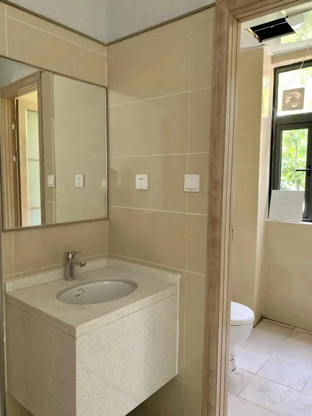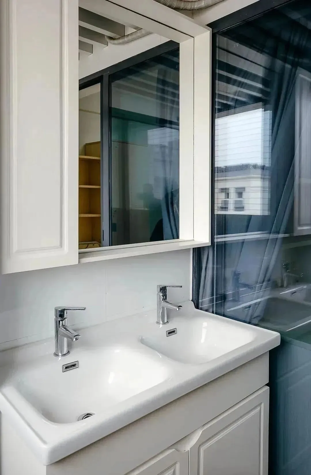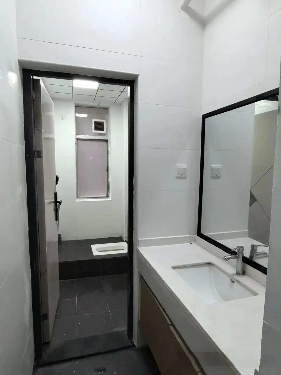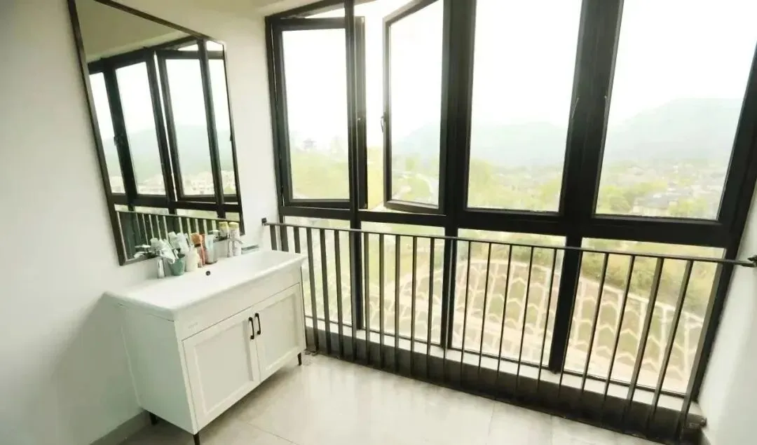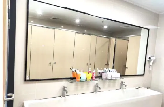 床铺为铁架床,有两个洗手台,两个独立卫浴,有阳台,有一面大镜子,面对着两个单间宿舍。