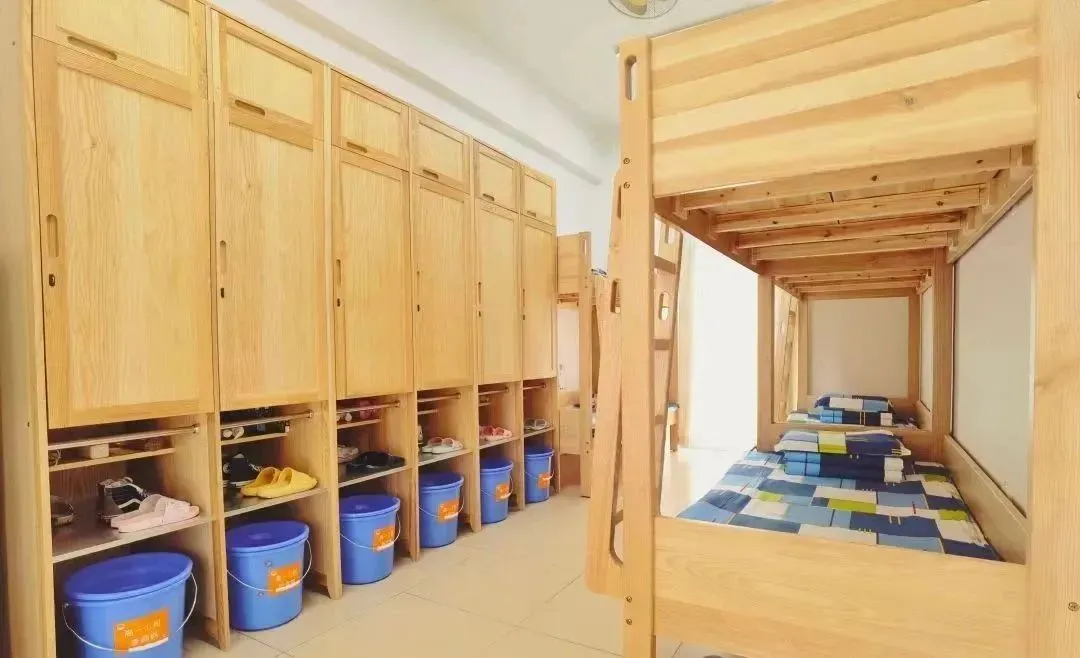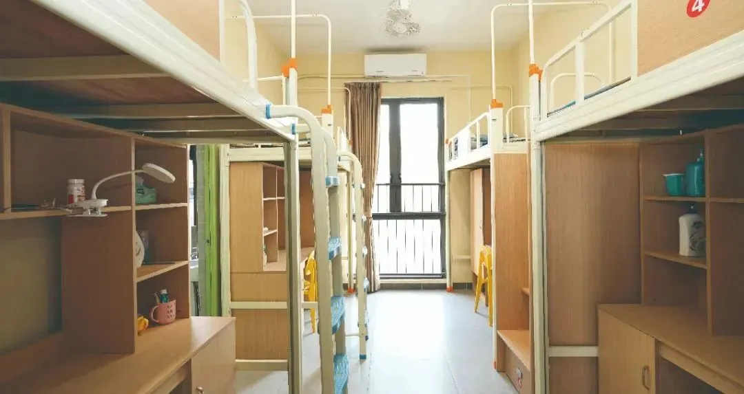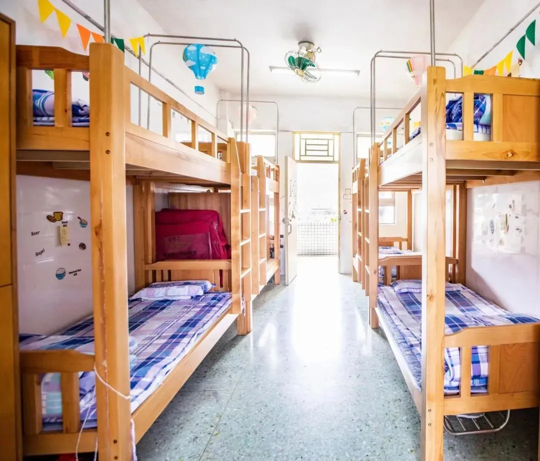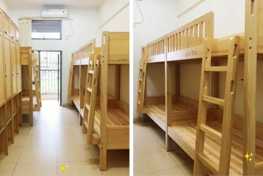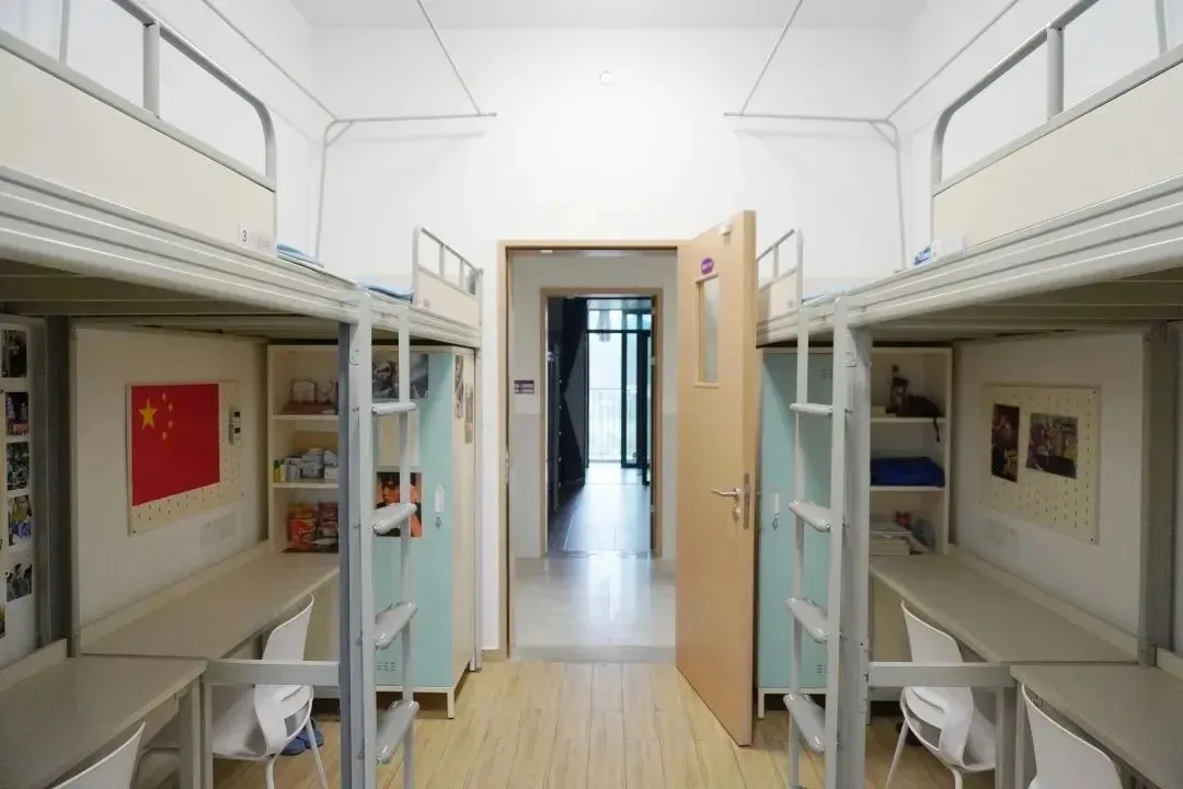 标准为 6 人一间,但会根据班级情况灵活调整。女宿配备地柜、衣柜和零食柜,宿舍内还设有电话方便与外界联系。每一层都有公共的洗澡间、卫生间和洗漱间。男女宿舍楼下设有小卖部、洗衣房,女宿楼下还有理发室和医务室,生活便利性拉满。