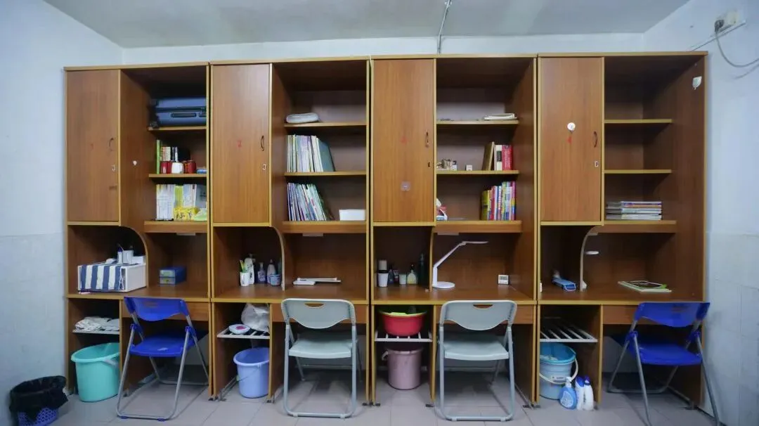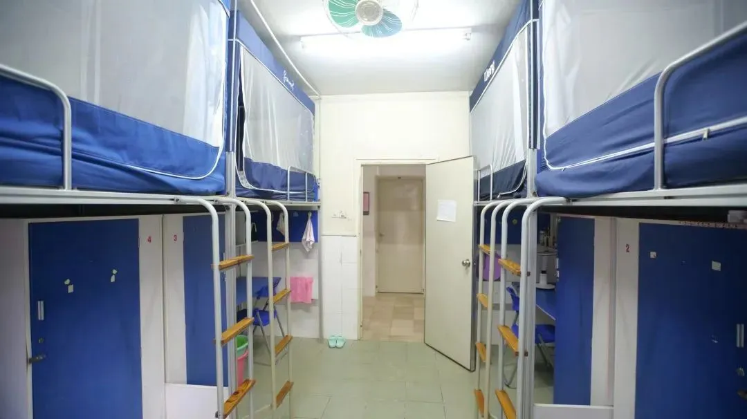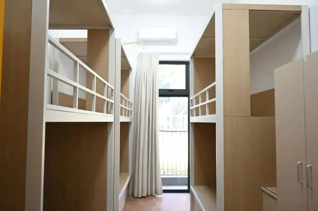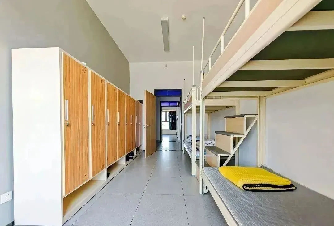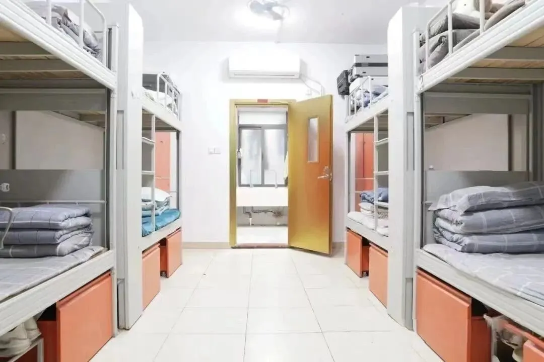标准为 6 人一间,但会根据班级情况灵活调整。女宿配备地柜、衣柜和零食柜,宿舍内还设有电话方便与外界联系。每一层都有公共的洗澡间、卫生间和洗漱间。男女宿舍楼下设有小卖部、洗衣房,女宿楼下还有理发室和医务室,生活便利性拉满。