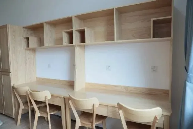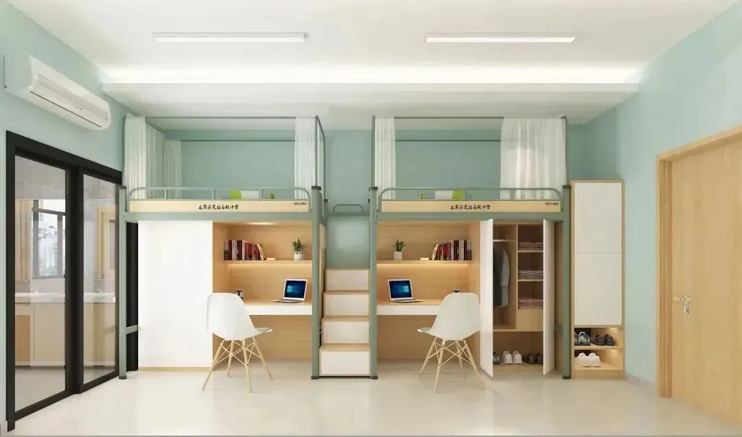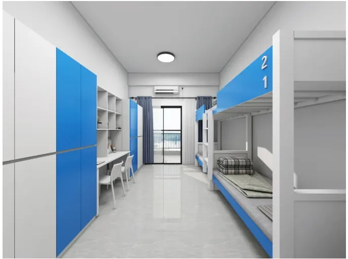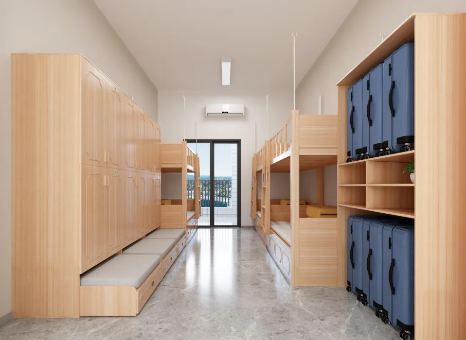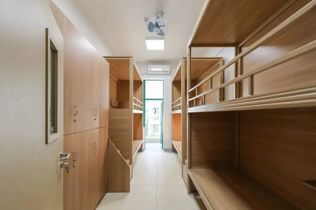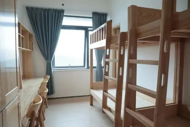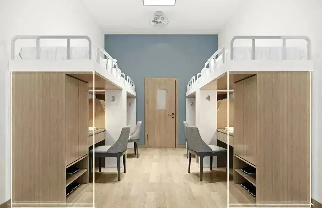 学校学生公寓采用6人间宿舍配置,每间宿舍均配备2个独立卫浴和3个洗漱池,满足学生的日常生活需求。宿舍内部采用全实木家具,搭配落地式门窗,确保室内采光充足且风景宜人。此外,宿舍还配备了落地式单人双柜,最大化储物空间,超高顶层架构设计,为学生提供开阔的活动空间。在这里,学生可以享受到家庭般的便捷生活。