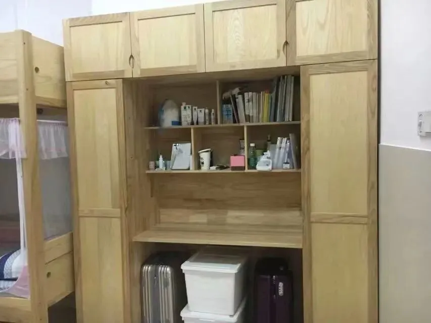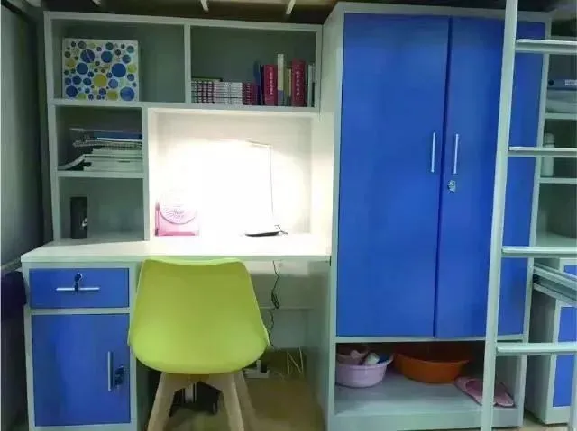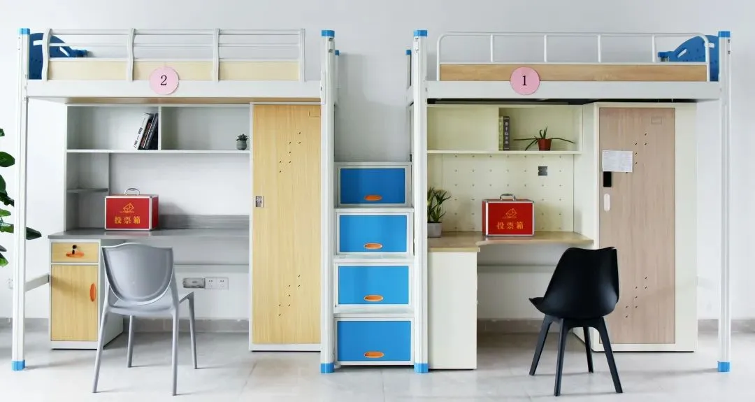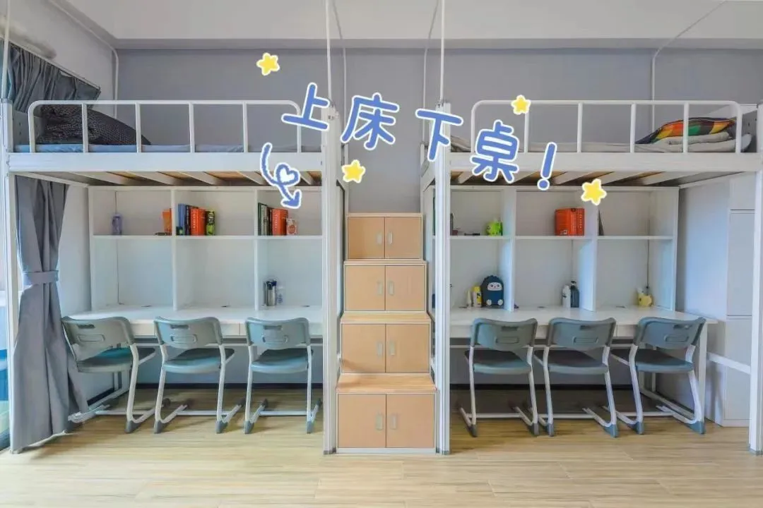 床位上床下桌+一个三层书柜+一个三层鞋柜+双层落地柜+抽屉。每间宿舍有冷暖空调+风扇+独立卫浴+洗手台。每栋宿舍楼有一间洗衣房:洗衣机+烘干机。