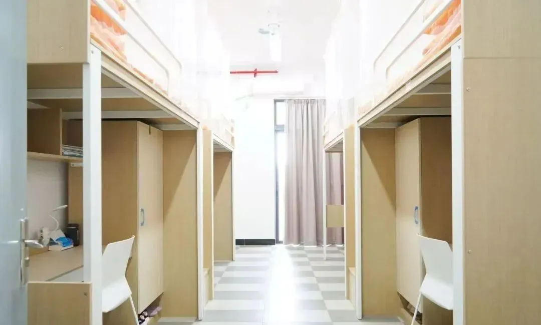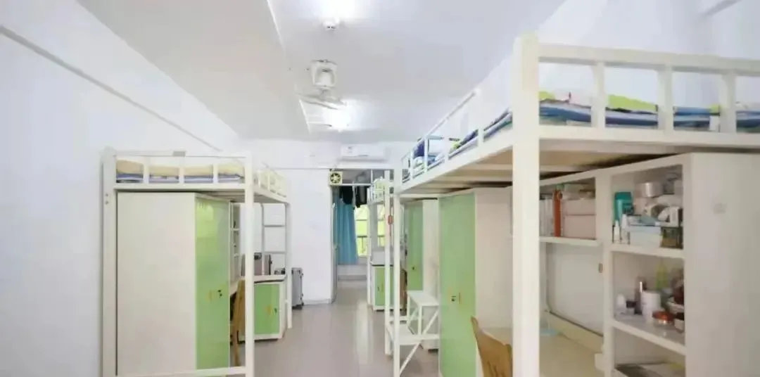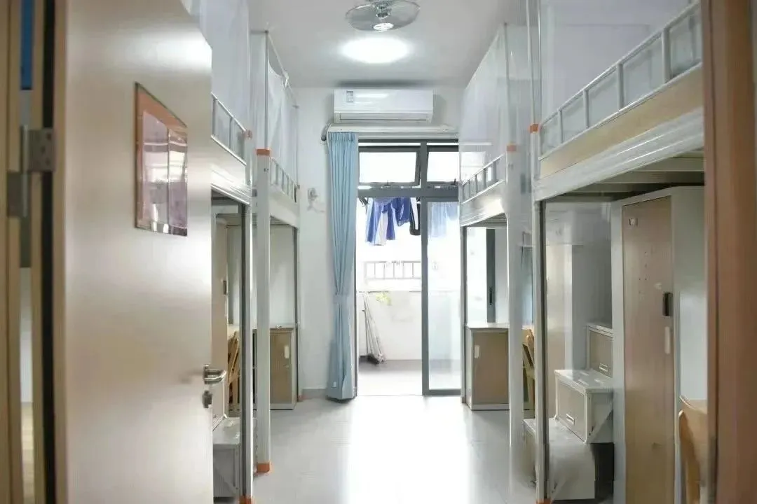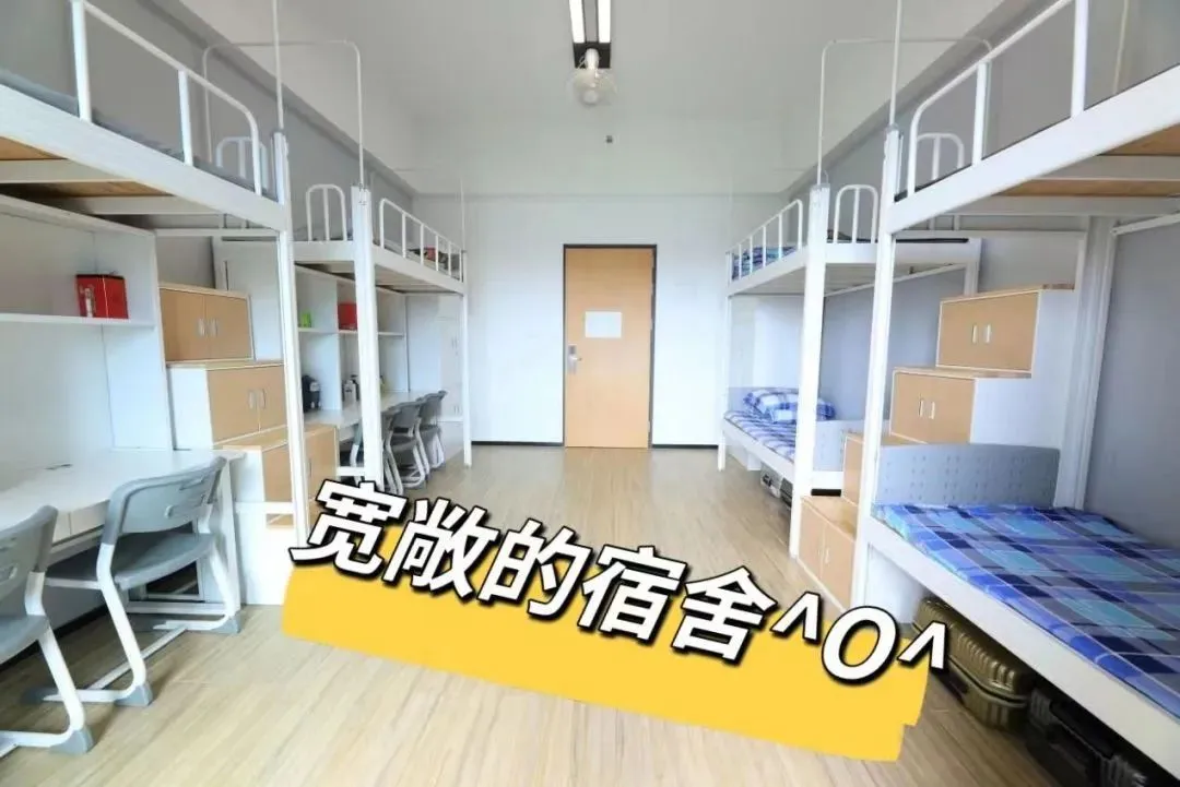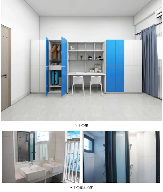 学生宿舍有个人独立书架、衣柜、写字台,空调和风扇也为标配。男生宿舍有独立阳台和卫生间(少数无独立卫生间),女生宿舍有独立阳台,每层设有两个公共卫生间和两个公共浴室,24 小时供应热水,保障同学们随时都能享受舒适热水澡。
