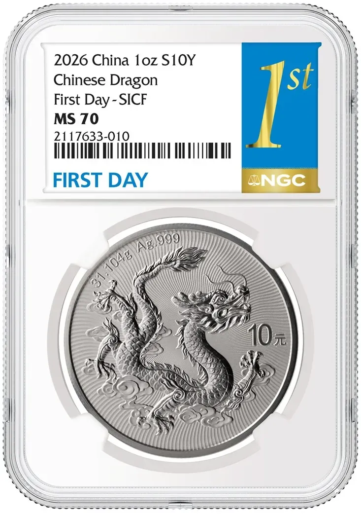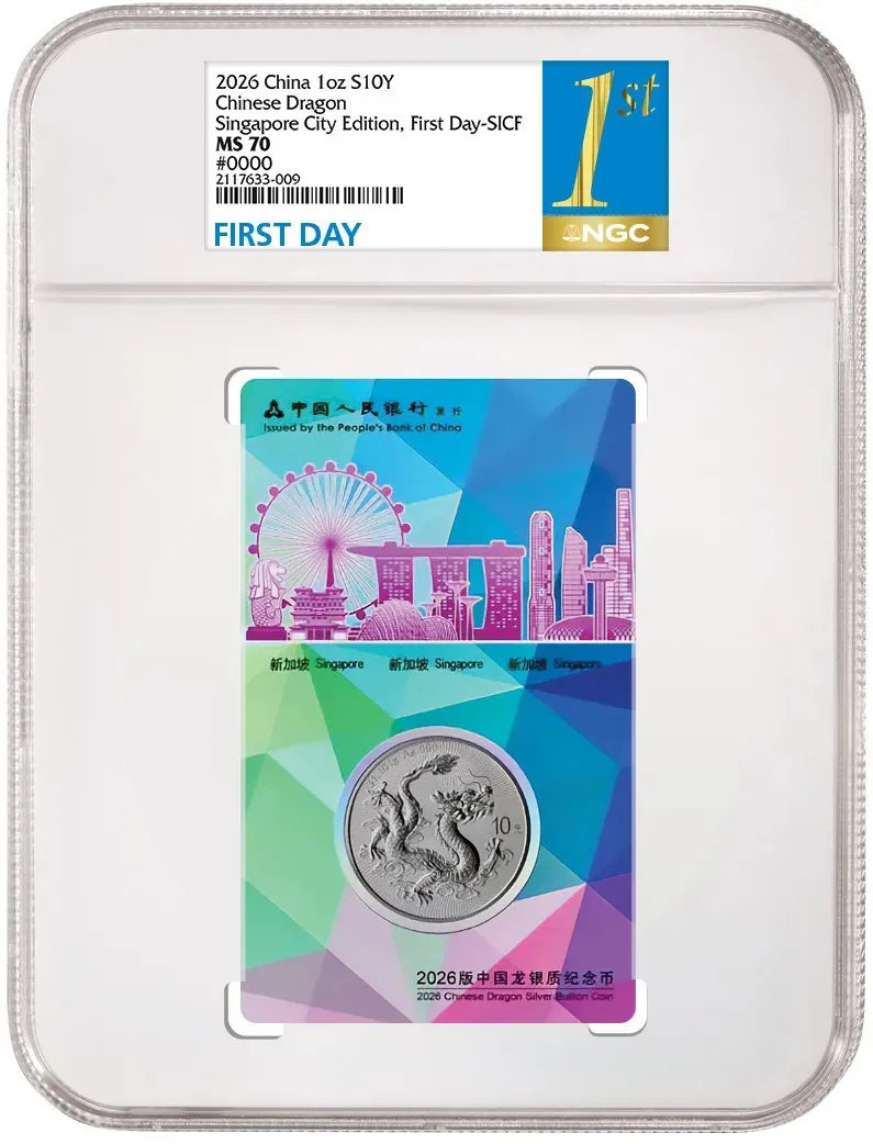在2026年3月20日至22日于新加坡滨海湾金沙的金沙会展中心(Sands Expo & Convention Centre)举办的2026新加坡国际钱币展销会(SICF)上,NGC授权经销商Panda SG将在现场独家接收向NGC提交评级并申请选用“First Day – SICF”(首日 – SICF)或“SICF Show Releases”(SICF展会发行)标识的2026版中国龙银币。