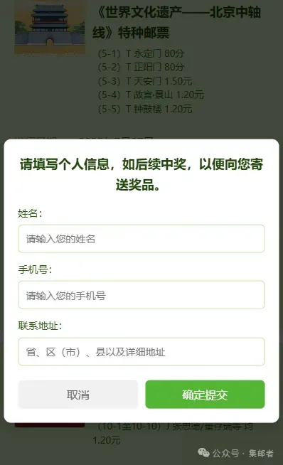 4.点击“为这套邮票投票”,先完善个人信息,之后可参与投票,点击邮票头像小图,可查看这套邮票的大图
