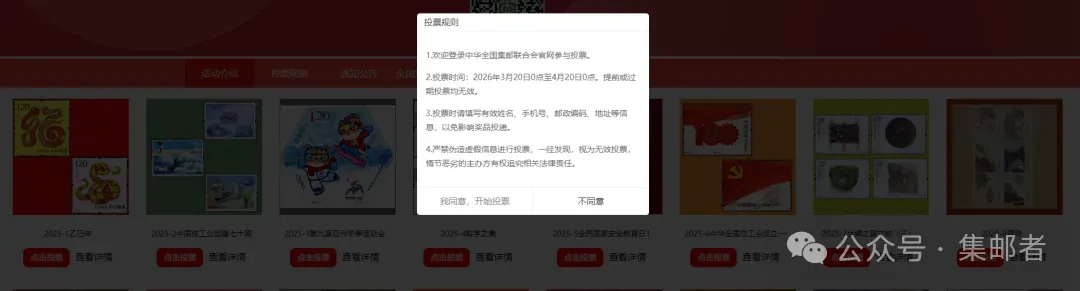 2.投票页面可以浏览所有参评邮票,可以查看活动介绍、投票规则、通知公告等。点击投票按钮参与投票。