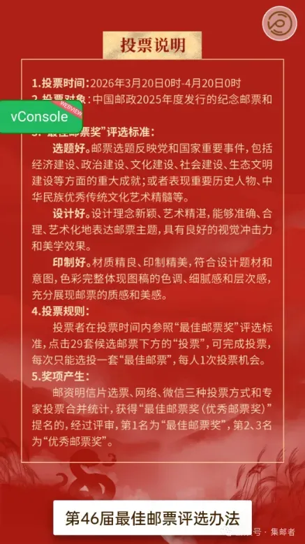 由集邮联组织的第46届最佳邮票评选活动3月20日正式开启。邮友们记得投票哦。