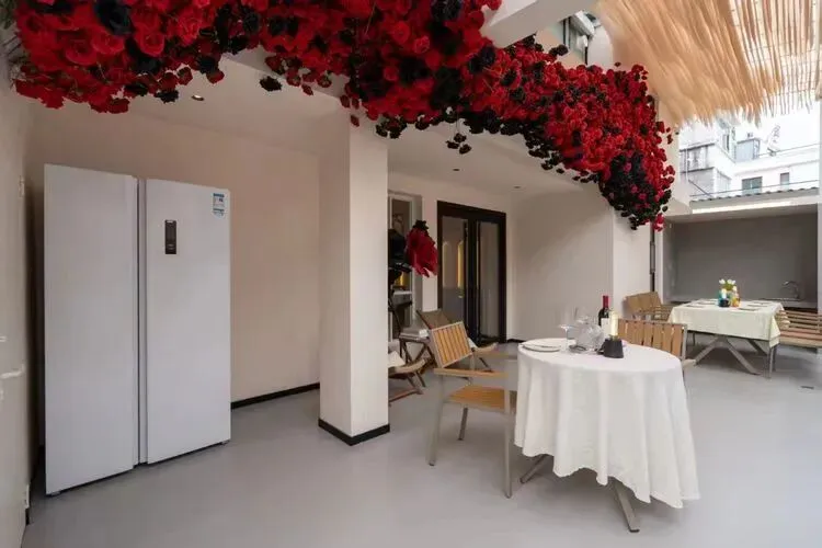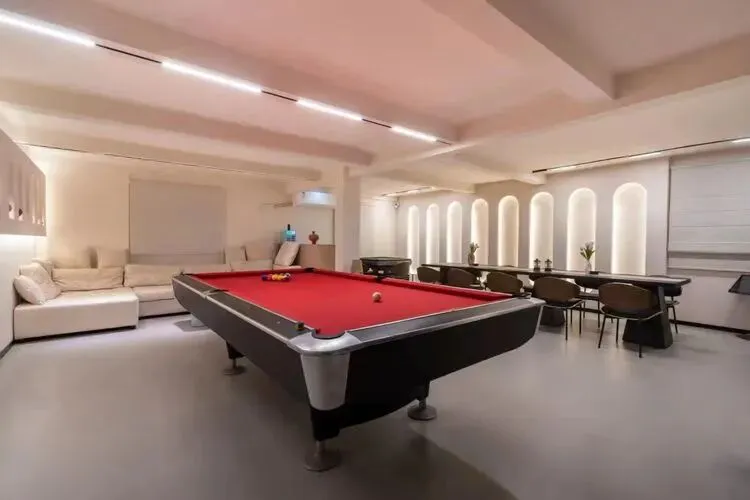 民宿共有一个客厅,其一功能为修葺观影,其二作为娱乐室,配有游戏机、专业K歌音响、麻将机、冰箱等。