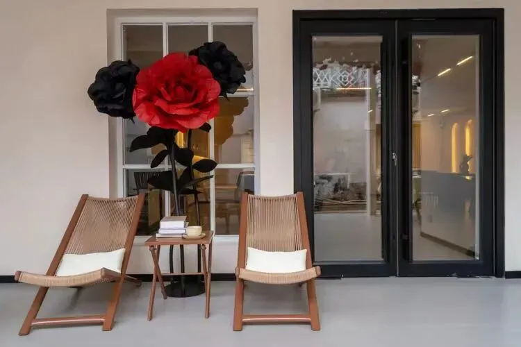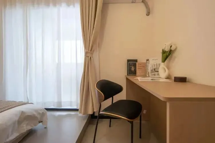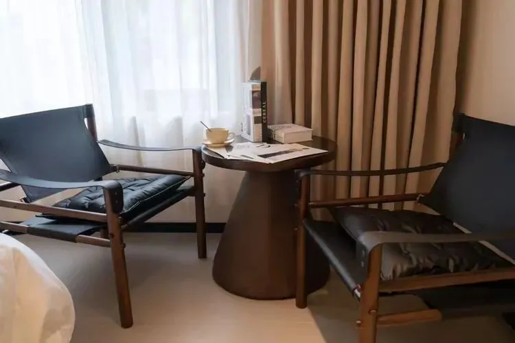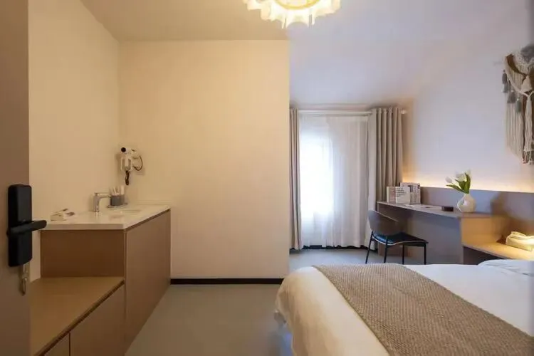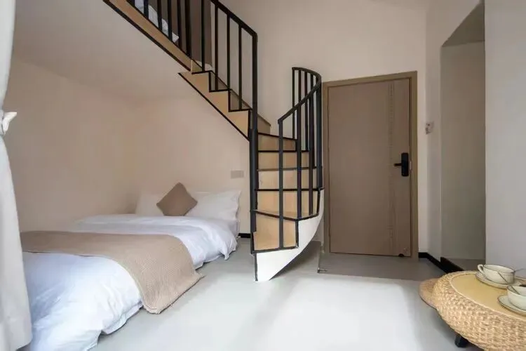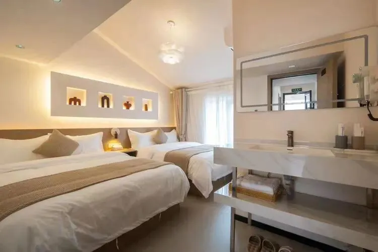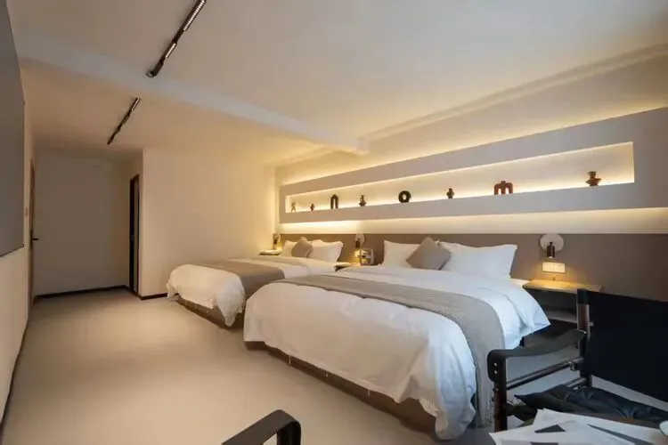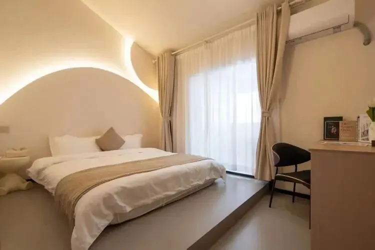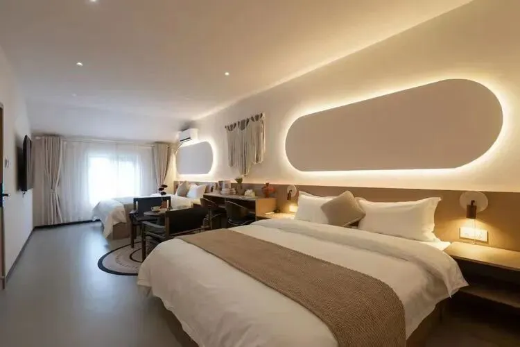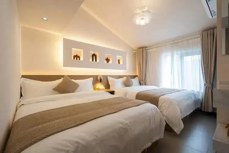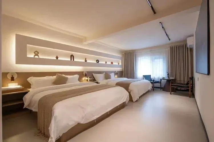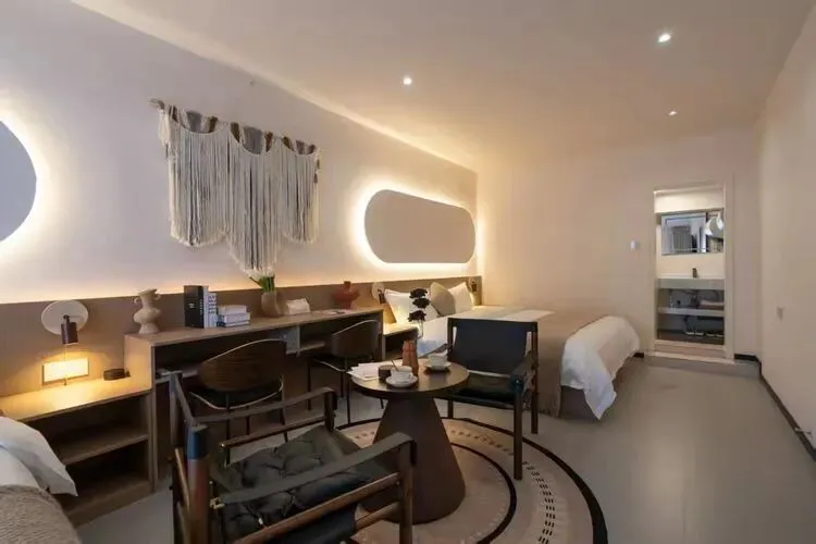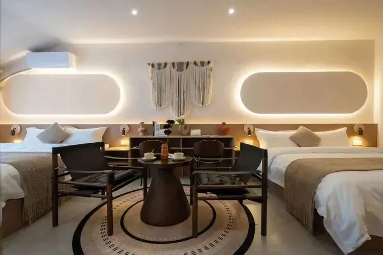 民宿共六间房,设有5张1.8米大床,6张1.5大床。房间内设计多采用弧面和凹陷的木作工艺,增加房间的灵动性。房间内设施用料十足,五层材质的回弹床垫、80支的布草、100寸极品投影仪、75寸小米电视、专业k歌音响,品牌洗漱用品,高速吹风机等均为标配。