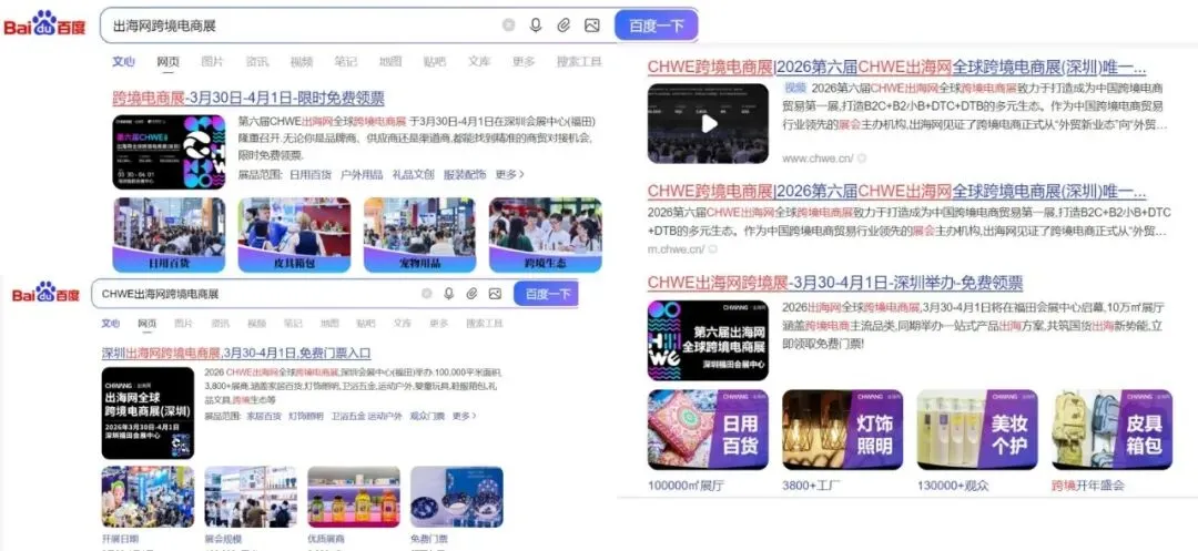 关键词全面优化,百度首页强势占位。不管搜 “深圳跨境展”还是“CHWE 展会”第一眼就是我们!