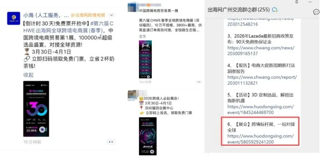全国跨境电商群、卖家群、工厂群每日推送免费门票、1V1 选品会、大卖福利精准送达领票人数一路狂飙。