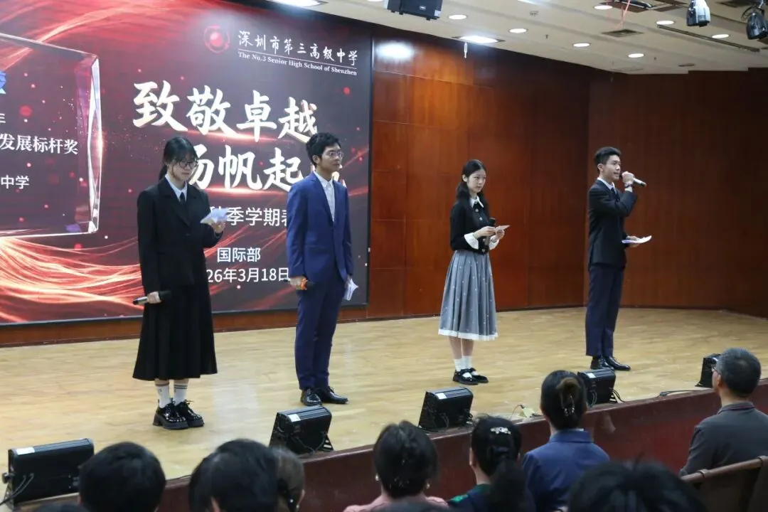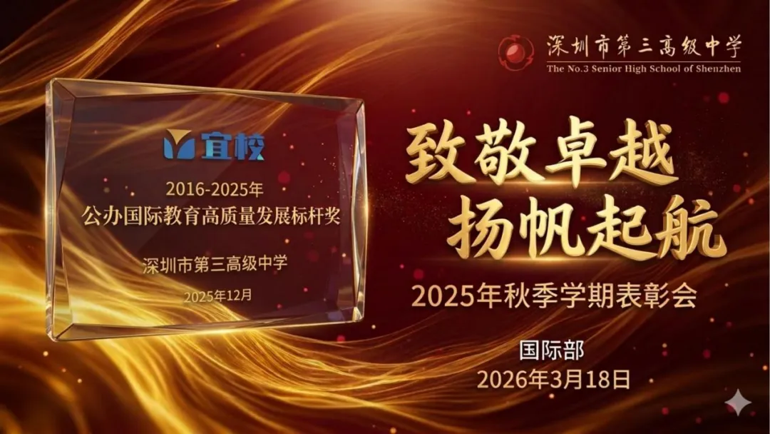 榜样如灯,照亮前行之路。愿全体国际部学子以此次表彰为新的起点,铭记“家国情怀、学会学习、自立自强”的嘱托,以优秀为帆,以奋斗为桨,在深圳三高这片沃土上,不负春光,不负韶华,朝着心中的梦想,扬帆起航,致敬卓越!