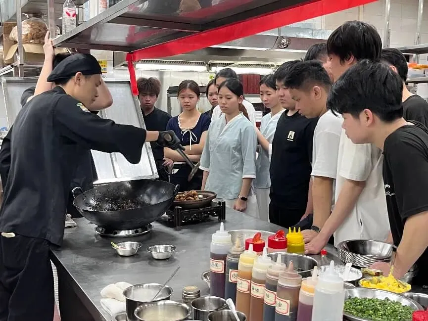培训过程中,倪泽显副厨师长结合自身丰富的行业经验,对每道菜品的食材处理、烹饪技巧、火候把控等环节进行悉心指导、细致讲解,从食材选购的小窍门到烹饪过程中的易错点,逐一拆解、耐心答疑。现场学生学习热情高涨,认真聆听、主动提问,互动氛围十分浓厚。