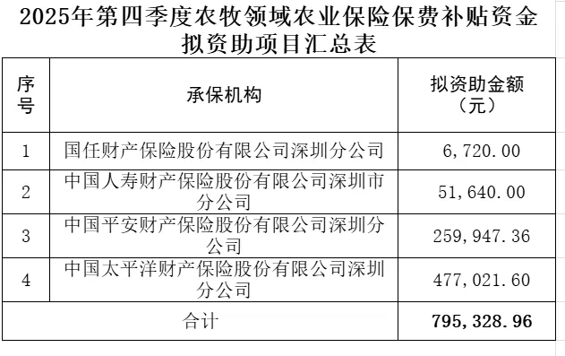 根据《深圳市政策性农业保险实施方案(2024—2026年)》(深财工贸〔2024〕31号)《深圳市乡村振兴和协作交流局关于深圳市农牧领域农业保险保费补贴资金的实施细则》(深乡村振兴规〔2024〕6号)等有关规定,经深圳市乡村振兴和协作交流局党组会议审定,拟对中国太平洋财产保险股份有限公司深圳分公司等企业(见附件)分别给予2025年第四季度农牧领域农业保险保费补贴资金资助,现予以公示。