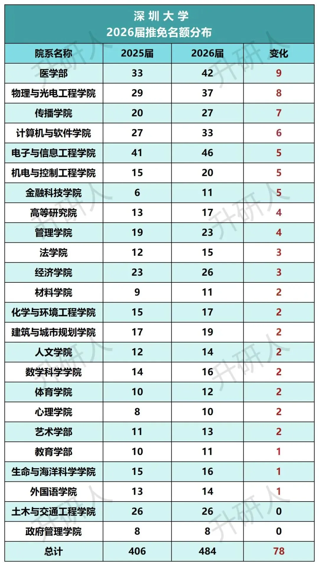 深圳大学2026届推免指标共计484人。结合近两年推免数据对比分析,2025届该校本科毕业生6803人,推免指标406人;2026届毕业生规模增至7159人,推免指标相应提升至484人,净增78人。