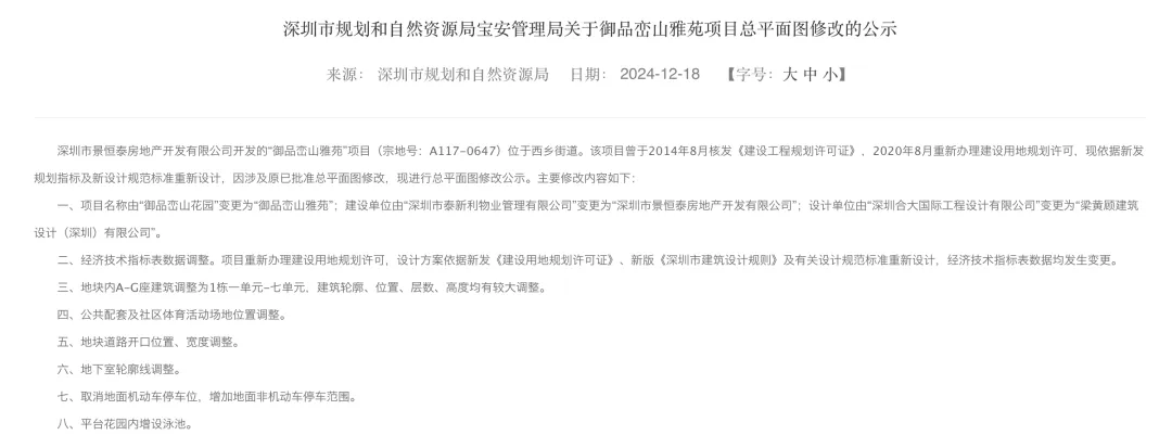 项目名称由“御品峦山花园”变更为“御品峦山雅苑”;建设单位由“深圳市泰新利物业管理有限公司”变更为“深圳市景恒泰房地产开发有限公司”;