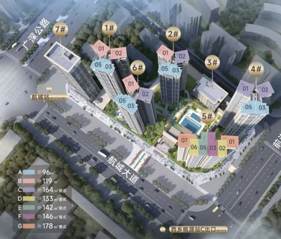 - 双地铁上盖,楼下即地铁12号线西乡桃源站,步行约50米可达,在建的20号线二期航城站也在500米范围内,未来还将有28号线规划交汇,形成三地铁格局,出行便捷。