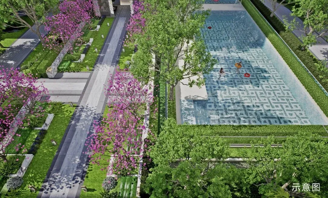 度假风情式的灵动泳池,消弭与天地的界限天光云影跌入碧波,岸边花树晕开整片画卷的“镜花水月