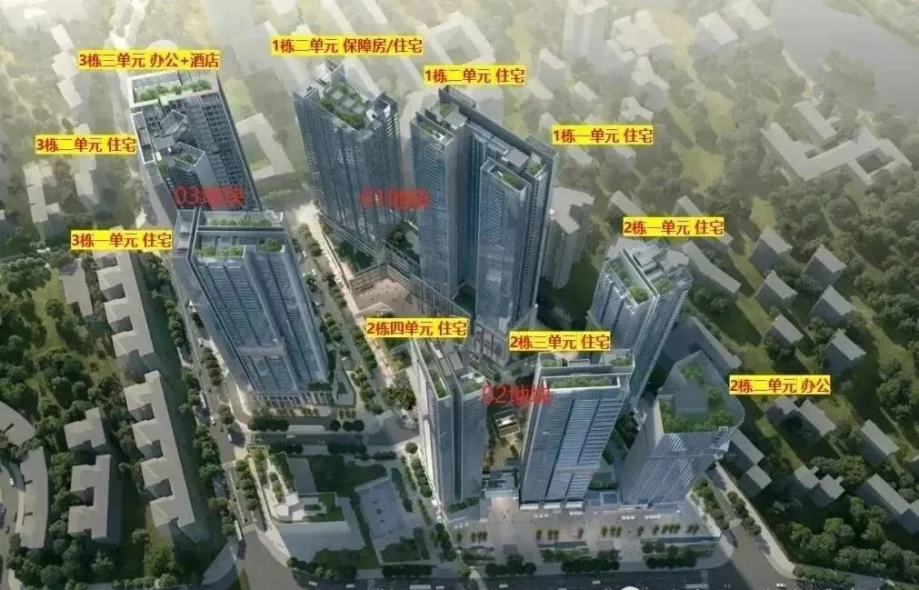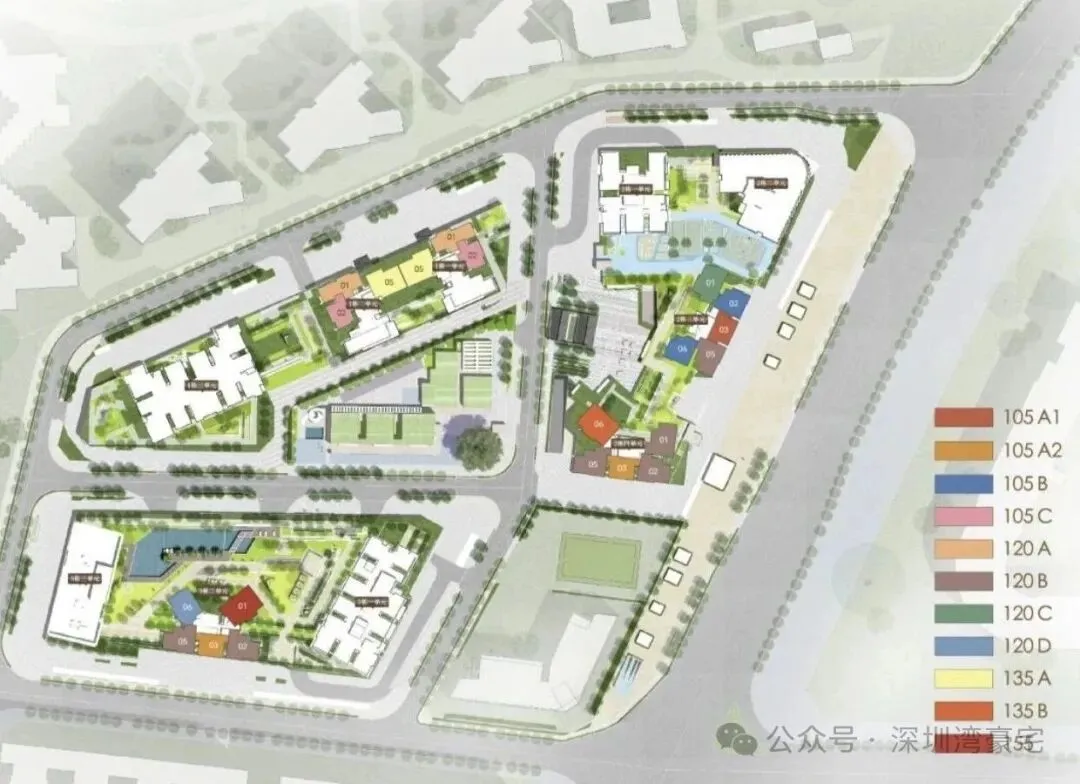 【翰熙典居】位于深圳南山粤海街道腾讯总部旁,前身为“桂庙新村旧改项目”。总建面约37万㎡,建成后将成为集住宅、商业、办公及酒店为一体的大型综合项目,能为片区供应含保障房在内近25万㎡住宅。2023年2月,桂庙新村旧改正式开拆。同年5月发布实施主体确认公示,内容显示其补偿方式为产权置换和货币补偿相结合,已完成100%签约;项目实施主体拟确认为深圳市贯凯投资有限公司,隶属于深圳市阳光华艺房地产有限公司。阳光华艺房地产公司已深耕深圳23年,主营房地产开发,旗下有建筑施工企业、物业管理公司、酒店经营管理公司等,运营有自有品牌酒店,已经成功开发了阳光华艺大厦、南山城市花园、流塘阳光花园、阳光海滨花园等多个旧改楼盘,在行业内颇有名气。2023年9月,项目终于开始动工。项目总投资83.56亿元,共分三期开发,项目总规划1038套,除去保障性住房和回迁房,总共可售714套商品房;其中保障房612套、回迁179套、规划停车位834个,车位比为1:0.83,车位略紧张。【翰熙典居】总占地70224㎡(相当于10个标准足球场大小),定位是打造集居住、商业、办公、酒店及公共配套设施为一体的综合社区。项目开发建设用地41660㎡,容积率8.9,计容建筑面积369100㎡,包含住宅249950㎡(含人才住房和保障性住房32500㎡),商业、办公及旅馆业建筑106530㎡(含商业文化设施不低于5330㎡)。另外,项目还有规划近12620㎡的公共配套设施、3200㎡ 的12班幼儿园、占地面2900㎡公交首末站等,并配建占地面积1500㎡的社区体育活动场地。01地块规划:占地总建面约17.3万㎡,住宅建面约8.9万㎡,商业建面约3.2万㎡,容积率9.28。规划为3栋超高层塔楼住宅+1栋幼儿园,1栋一、二单元55层,1栋三单元为44层。