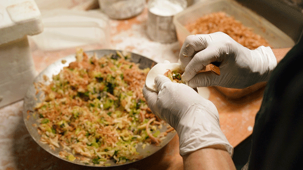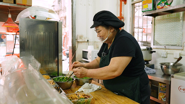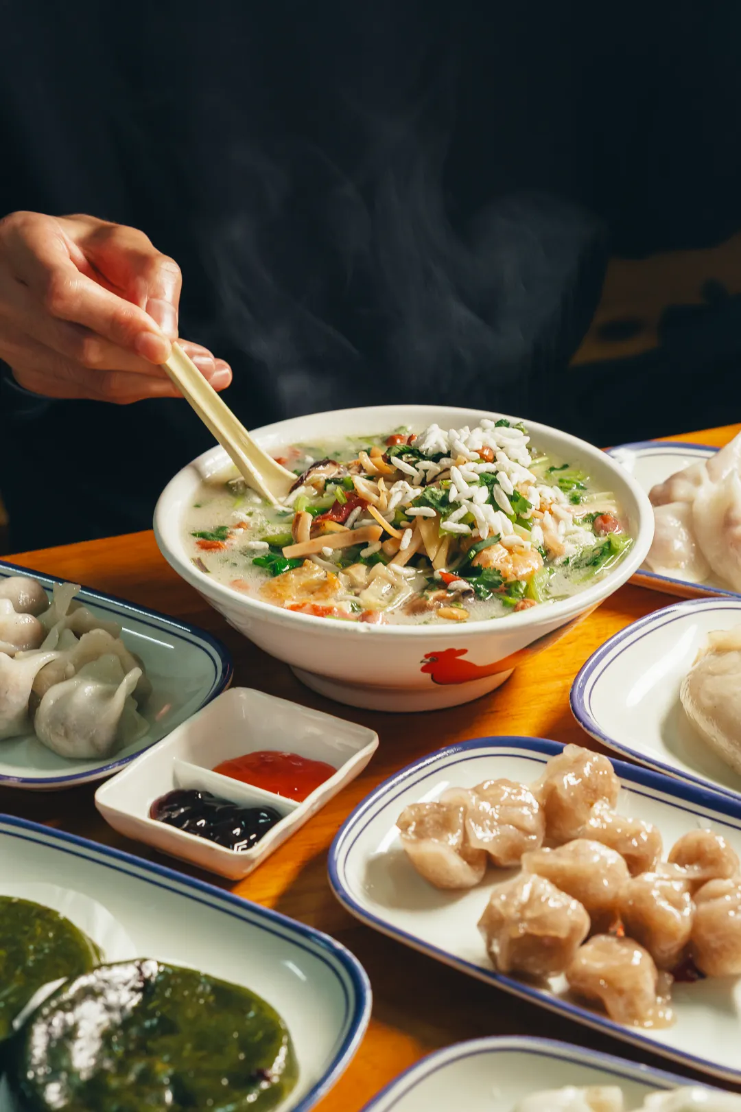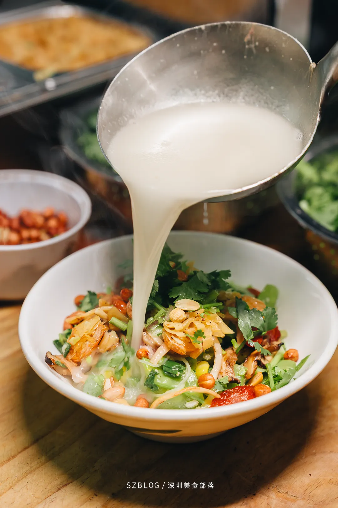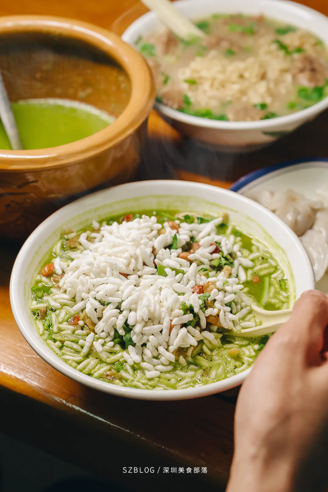 包菜、芹菜和细粉丝打底,再配上鱿鱼干、虾米、香菇、萝卜干和腊肠;最后淋上猪骨高汤,撒一把酥脆炒米,一碗热气腾腾的「汕尾菜茶」便完成了。