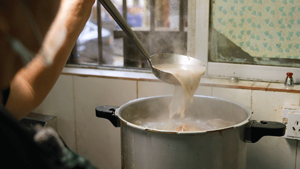 她家的汤底是每天现熬的猪骨汤,我们去的时候已是中午,阿姨揭开锅盖,里头的肉早已炖烂,香气扑鼻而来。