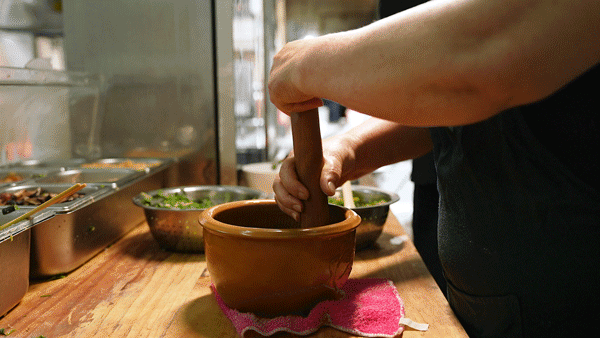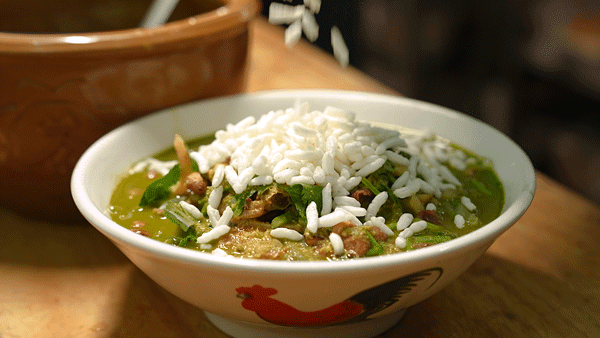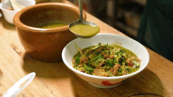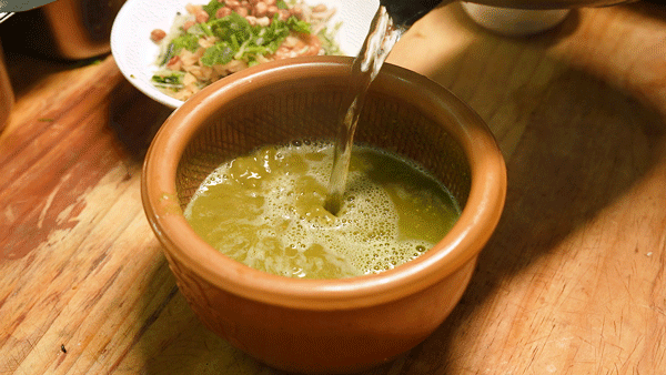 这次的擂茶,用的是枫树叶、艾草、薄荷、茴香、芹菜等新鲜食材。把它们细细研磨后,冲入开水,擂茶便做好了。再倒入备好的配菜,就成了一碗「陆丰油茶」。
