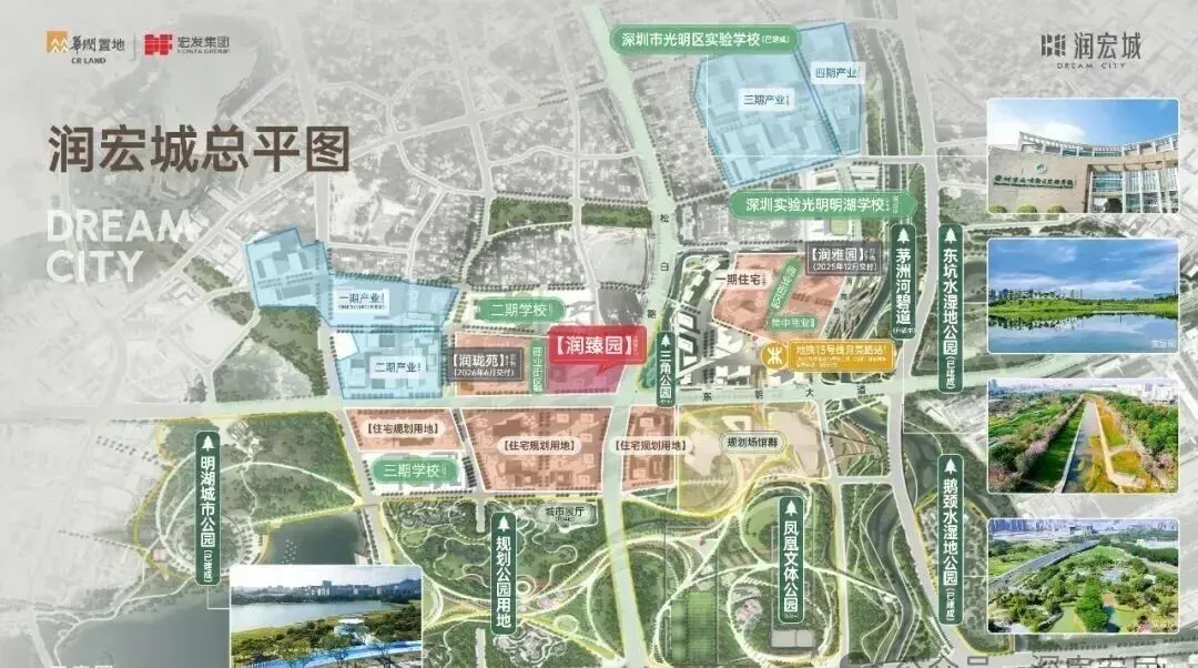 润宏城,位于光明区凤凰街道塘尾社区,总占地面积约195万㎡ ,总建筑面积约382万㎡,住宅面积高达172.44万㎡,分多期多地块开发,其中一期就分4个地块开发,前期入市的是润雅园已经基本售罄,还剩少量4房在售,这次润臻园就是1期其中一个地块,后面还有二期三期,另外产业配套也分4期开发打造,还规划有3所九年制学校、2所18班幼儿园,3所12班幼儿园,3所9班幼儿园。