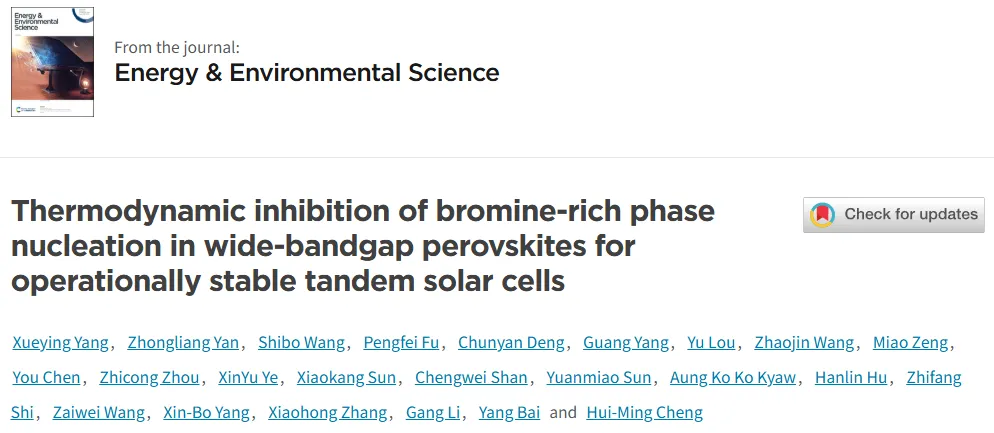 Energy & Environmental Science(EES)在线发表了中科院深圳先进院白杨&成会明院士&苏州大学杨新波&张晓宏&香港理工大学杨光团队题为“Thermodynamic inhibition of bromine-rich phase nucleation in wide-bandgap perovskites for operationally stable tandem solar cells”(热力学抑制宽带隙钙钛矿中富溴相成核以实现运行稳定的叠层太阳能电池)的最新研究成果。