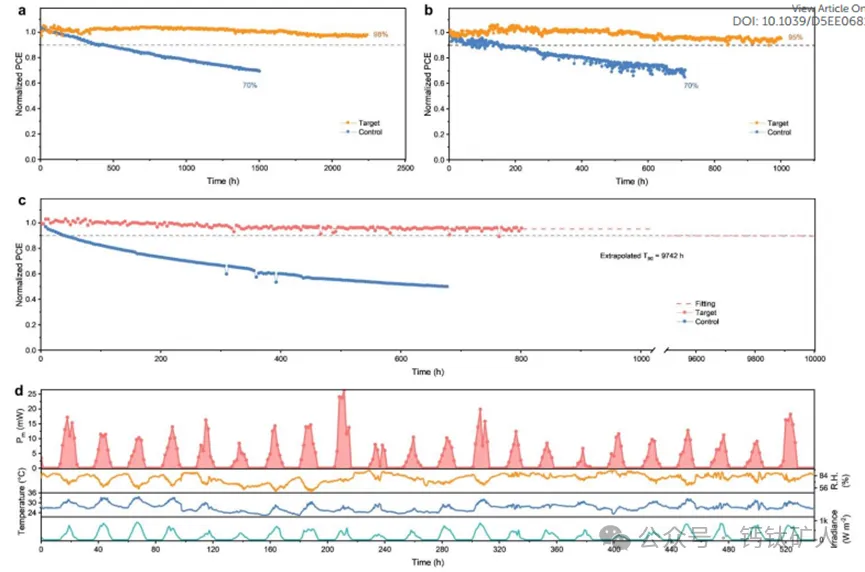 基于此,研究团队发现薄膜形成过程中富溴相的优先成核会引发本征成分不均匀性,这种不均匀性随后在运行应力下加速卤化物迁移和相分离。作者等人开发了一种预防性抑制策略,通过引入硫氰酸钾,从一开始就提高富溴相的成核能垒,从而实现热力学稳定的卤化物分布,抑制卤化物分离。该方法使1.68 eV单结器件实现了23.50%的高光电转换效率,同时器件展现出优异的稳定性,在连续最大功率点跟踪2240小时后仍保持初始效率的98%。利用这一稳定的吸收层,制备了效率达33.08%(认证效率32.52%)的钙钛矿-硅叠层太阳能电池,该电池在户外运行540小时后仍保持性能,并在连续最大功率点跟踪下实现超过9700小时的推算T90寿命。