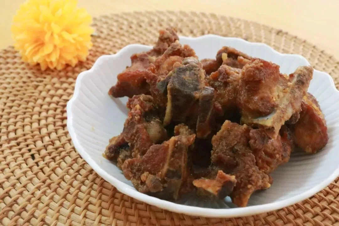 白米饭、手抓扇骨、青豆肉沫豆腐、蒜蓉油麦菜、海带黄豆猪骨汤