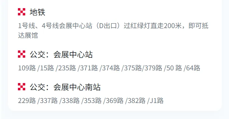 地铁:1号线和4号线:均可乘坐地铁1号线或4号线到“会展中心”站,从D出口步行约150米即可到达会展中心。