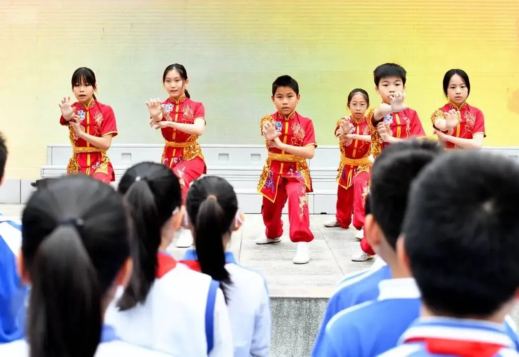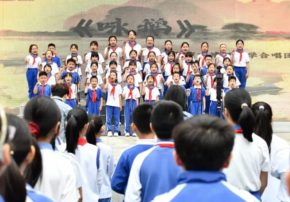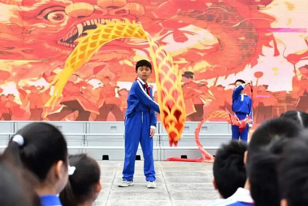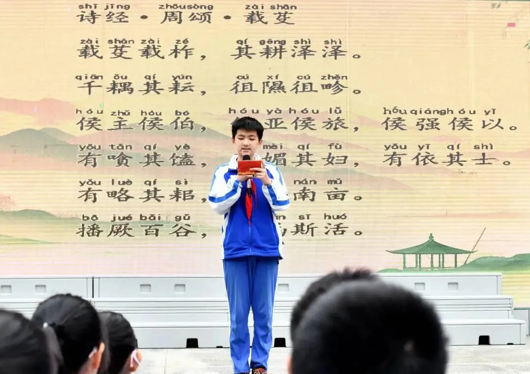文化展演环节精彩纷呈。融合班舞龙表演和武术队刚柔并济,诠释“本草强身”的深意;合唱团改编演绎古诗新唱,将热爱自然融入悠扬旋律;全校师生齐诵《诗经·周颂·载芟》,在古韵声声中再现春耕场景,将“敬天惜物”的中华智慧代代相传。