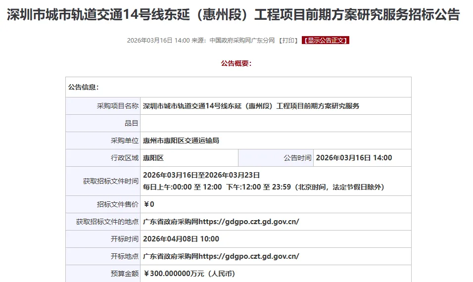 深圳市城市轨道交通14号线东延(惠州段)工程项目前期方案研究服务招标项目的潜在投标人应在广东省政府采购网https://gdgpo.czt.gd.gov.cn/获取招标文件,并于 2026年04月08日 10时00分 (北京时间)前递交投标文件。