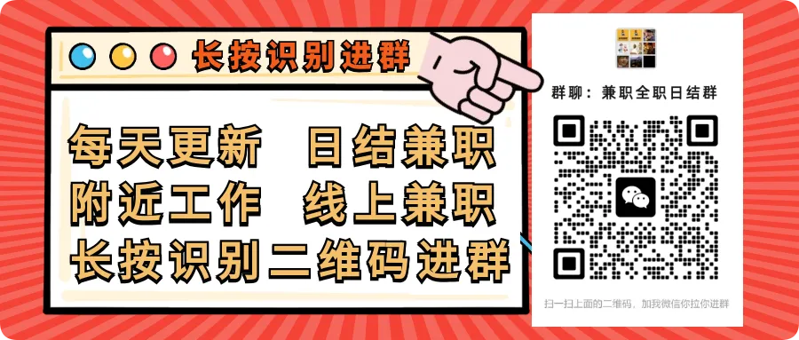 【报名方式】长按识别下方微信二维码添加好友报名回复【注意】不要缴纳任何费用!切记不要出借自己的身份证/银行卡/微信/支付宝/验证码等。岗位内容均为网络收集,如有问题本平台概不负责!