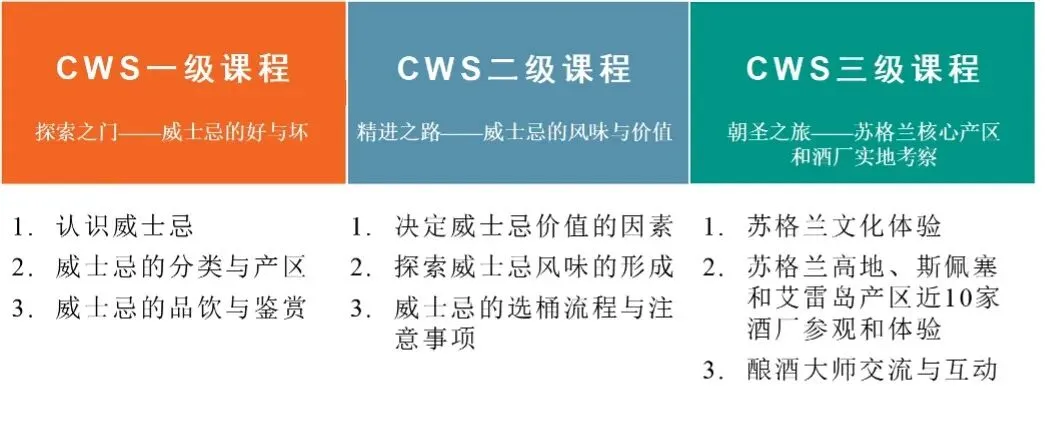 CWS威士忌协会(中国酒类流通协会—进口酒专业委员会,以下简称CWS)是中国最大的威士忌爱好者组织,意在以发展威士忌爱好者为核心,推动中国威士忌文化发展、规范中国威士忌市场、为威士忌爱好者提供专业服务的非营利组织。作为国内最早开发威士忌课程的组织,CWS威士忌课程是CWS专家团结合深耕行业多年的经历及一流威士忌大师的专业经验,设计开发的覆盖业内外人群的专业课程。 | 适合各类威士忌爱好者或从业者,了解威士忌基础和实用性知识 |