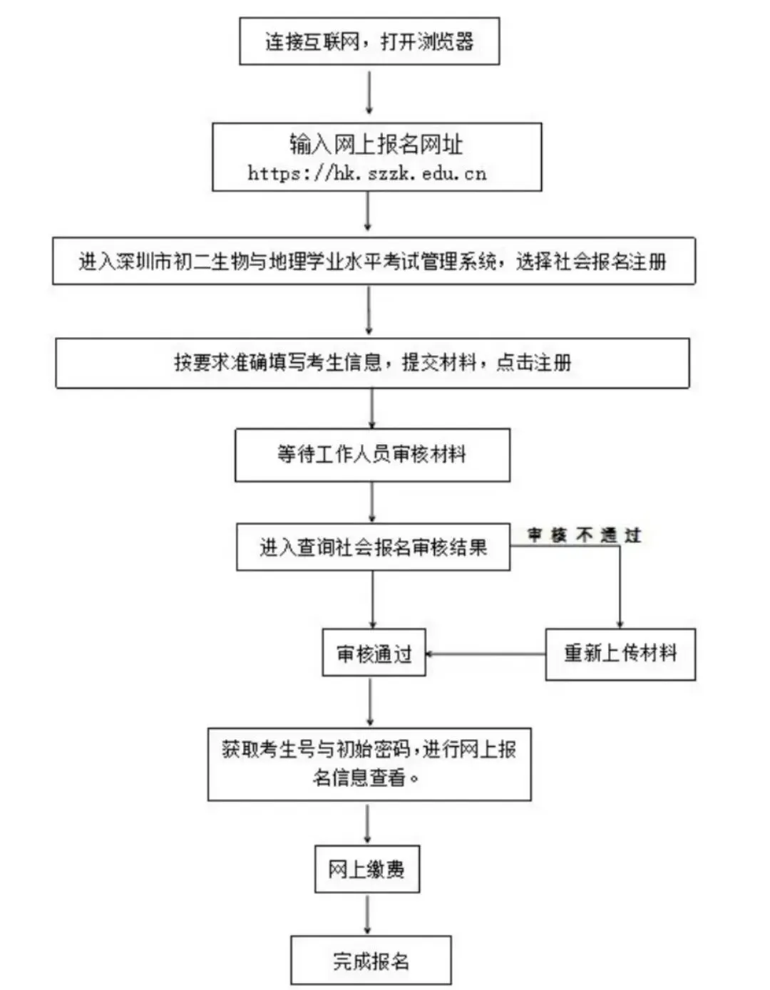 若考生网上报名审核不通过,须按照系统的不通过原因提示,重新补充审核资料,如多次上传资料失败或审核不通过,考生可咨询户籍所在区教育行政部门所设的报名点,按照工作人员指示进行操作。