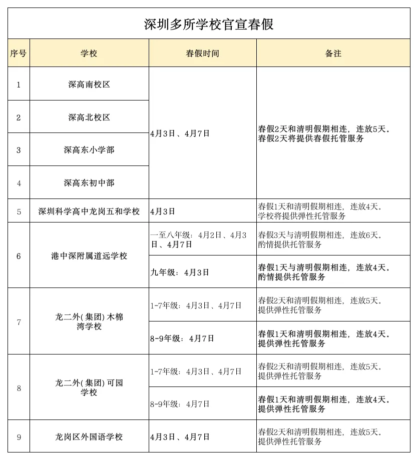✅深圳9所学校春假安排: