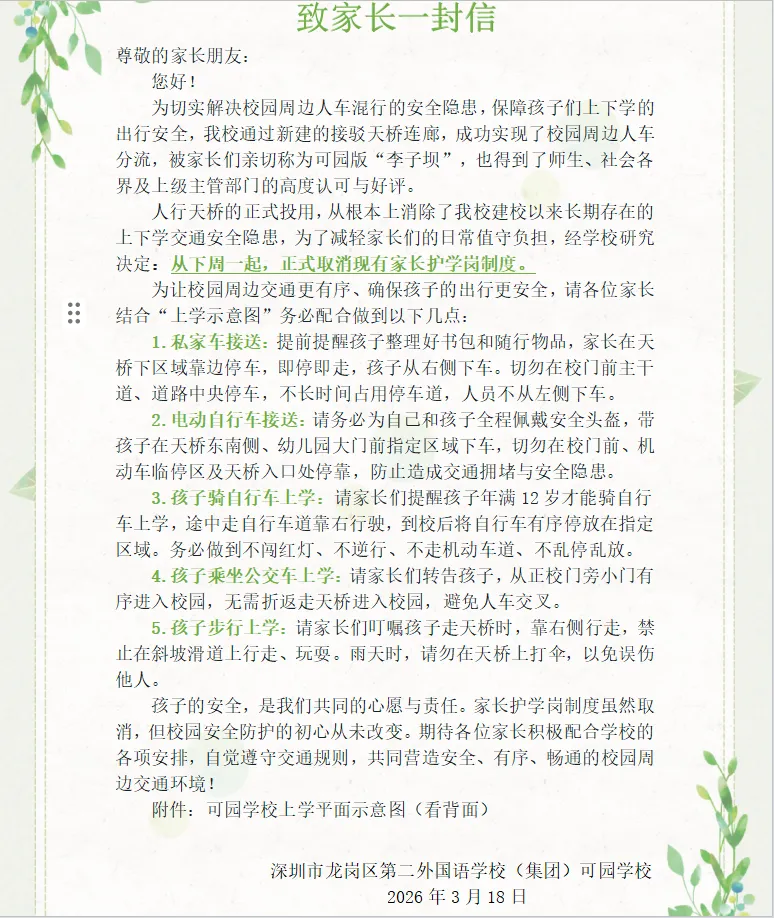 3月19日,记者从深圳市龙岗区第二外国语学校(集团)可园学校获悉,该校即将从3月23日(下周一)起,正式取消现有家长护学岗制度。