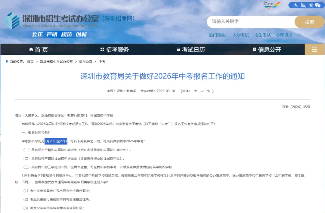 各位深圳中考考生、家长请注意!根据相关工作安排,深圳市初中学业水平考试(中考)及初二生物与地理学业水平考试报名工作,定于3 月 20 日至 3 月 27 日开展。为帮助大家顺利完成报名,现将相关注意事项梳理如下。