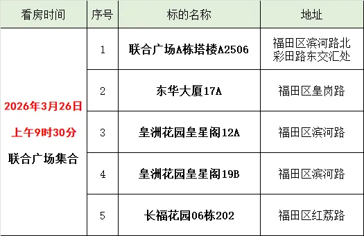 受委托,我司定于2026年4月9日10时至2026年4月10日10时止(延时除外)对深圳市福田区5套房产进行公开拍卖活动,现看房安排如下,有意者请电话预约看房(高小姐13714070888,朱先生13715268796)