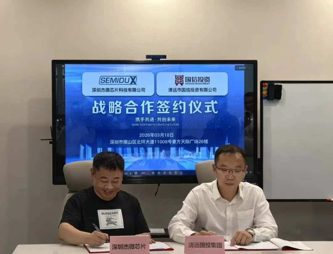 近日,在清远市人大常委会招商考察团和清远驻深圳招商先锋队的共同见证下,清远市国有投资集团有限公司(以下简称“清远市国投集团”)与深圳杰微芯片科技有限公司(以下简称“杰微科技”)在深圳成功签署战略合作框架协议并展开了深入的座谈交流。清远市人大常委会副主任邵军、预算工委主任赵辉、侨民外宗工委主任余爱国,清远市工信局党组书记、局长李晓宇,清远市国资委党委书记、主任罗伟民等出席并见证双方签约。